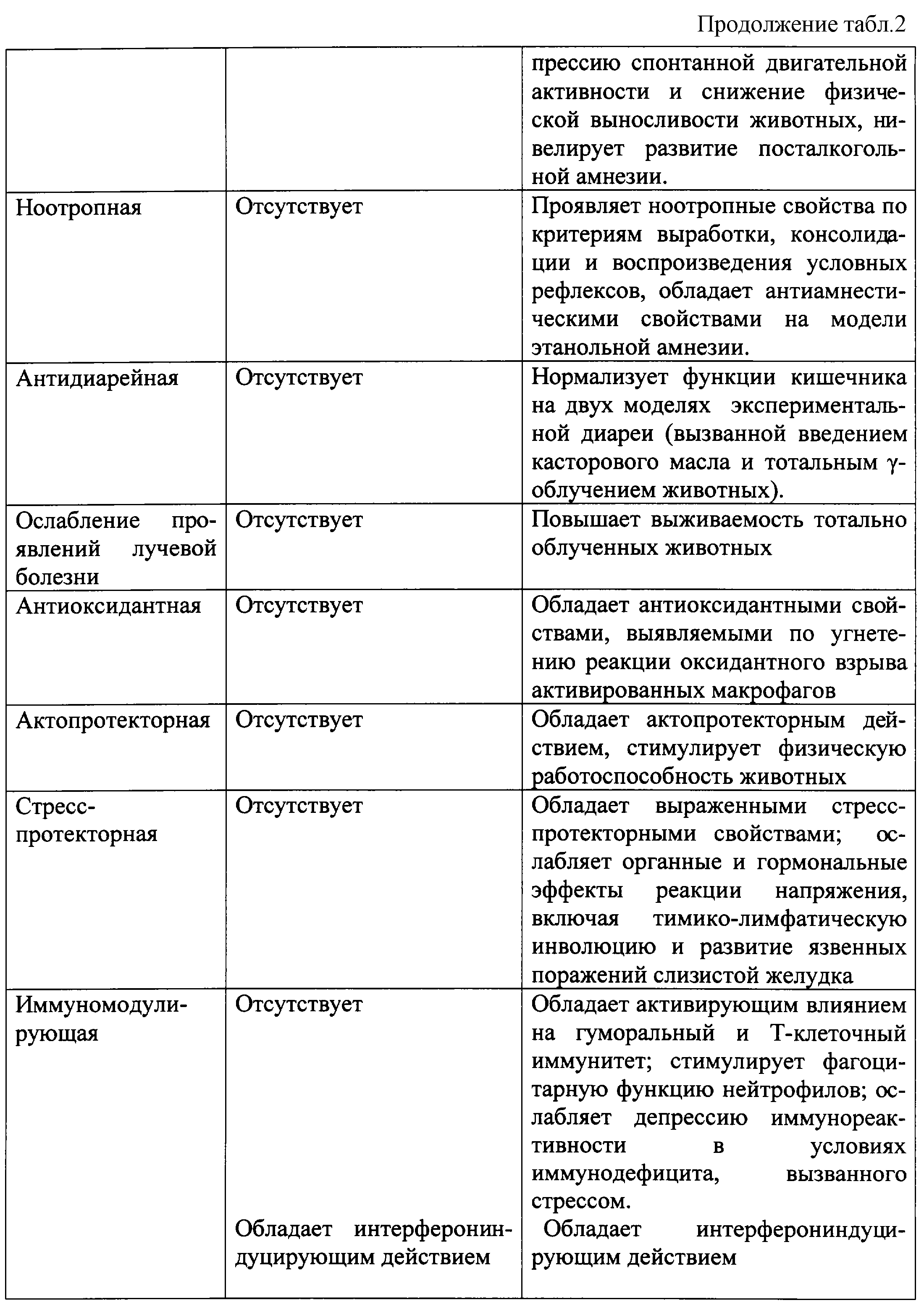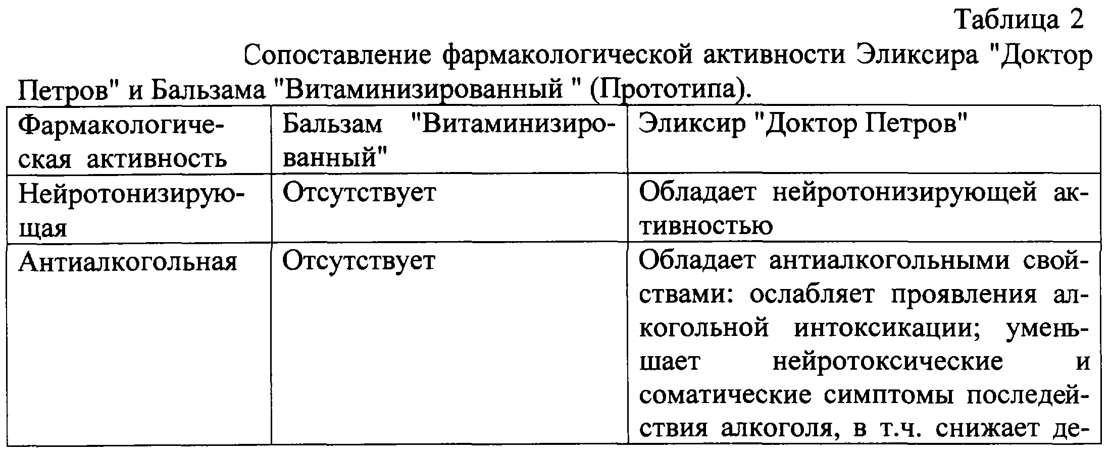 Эликсир отличается от всех вышеописанных фитопрепаратов, включая прототип, наличием антиалкогольного, антиоксидантного, антидиарейного, ноотропного действия. От прототипа эликсир отличается тем, что обладает нейротонизирующей, антиалкогольной, ноотропной, антидиарейной активностью, способностью ослаблять проявления лучевой болезни, антиоксидантными, актопротекторными, стресспротекторными свойствами (табл. 2).