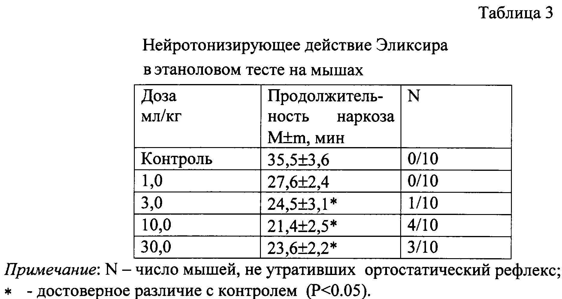Установлено, что деалкоголизированный эликсир при однократном пероральном введении в дозах, соответствующих 3, 10 и 30 мл/кг спиртсодержащего препарата, обладает нейротонизирующим эффектом. Об этом можно судить по отсутствию утраты ортостатического рефлекса у 10-40% мышей опытной группы и по существенному укорочению продолжительности этанолового наркоза у мышей, получавших эликсир за 1 ч до введения этилового спирта в наркотической дозе (табл. 3).