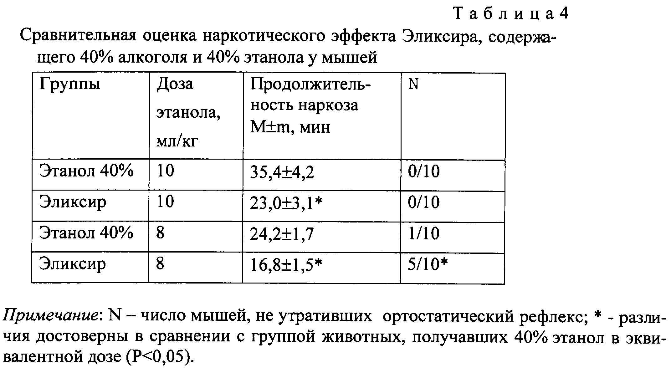 С целью выявления прямого антиалкогольного действия эликсира проводились сравнительные испытания наркотического эффекта нативного эликсира и 40% этанола.