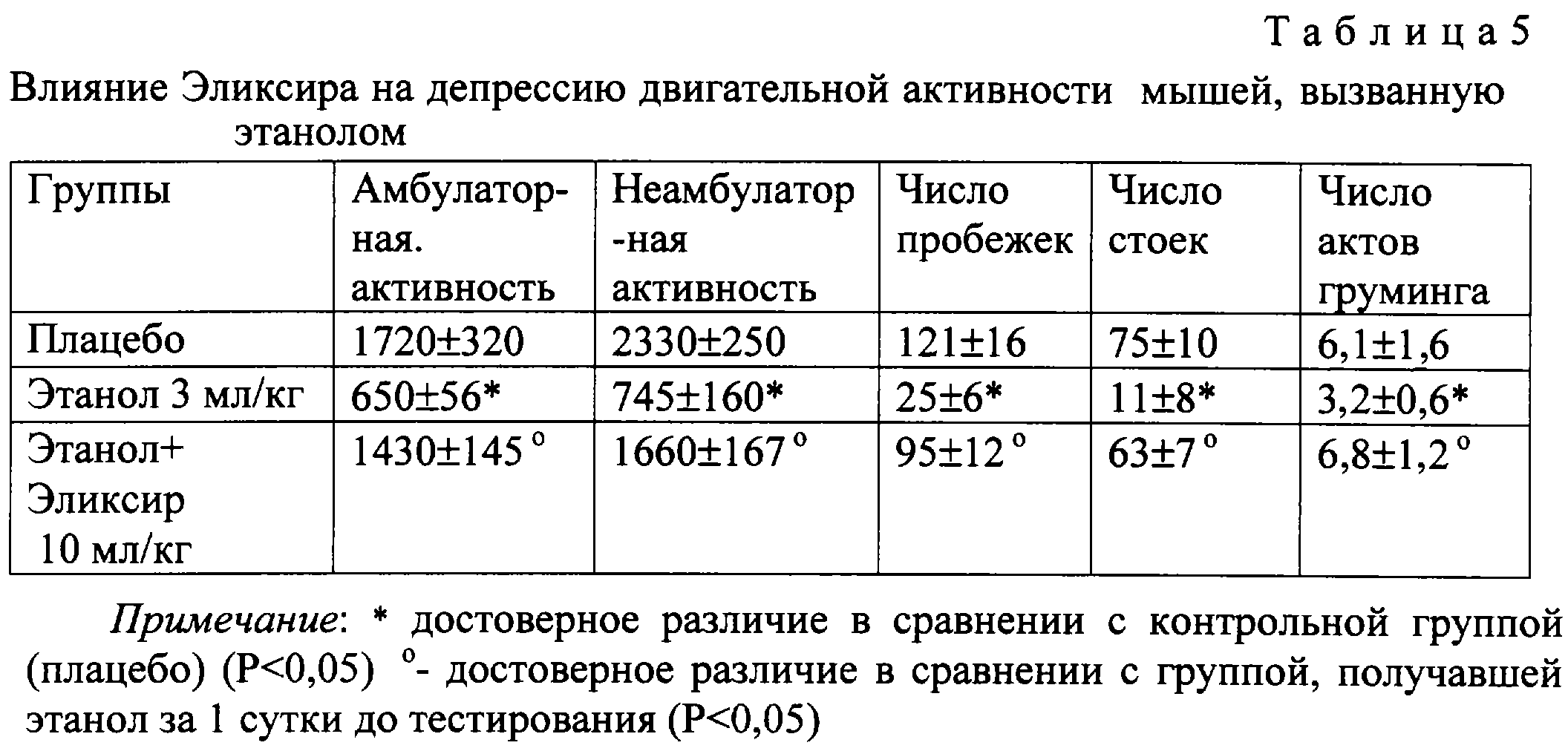 Данные, приведенные в табл. 5, свидетельствуют о выраженном угнетении всех параметров психомоторной активности у животных, получавших этанол, что свидетельствует об отсроченном нейродепримирующем действии последнего. Введение эликсира практически полностью устраняет посталкогольную депрессию и обеспечивает нормализацию параметров двигательной активности животных.