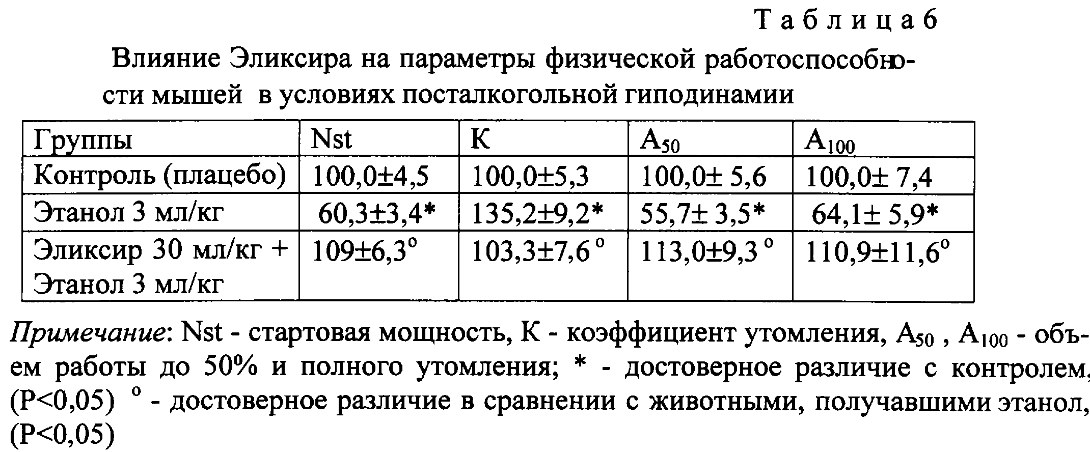 Установлено, что введение наркотической дозы этанола за 1 сутки до тестирования приводит к развитию у мышей выраженного гиподинамического состояния, проявляющегося снижением всех параметров физической работоспособности. Одновременное назначение деалкоголизированного эликсира обеспечивает выраженный протекторный эффект в отношении гиподинамического последействия алкоголя.