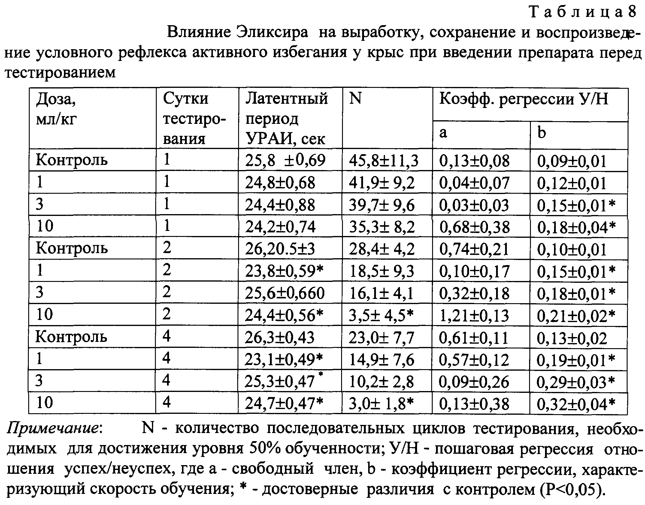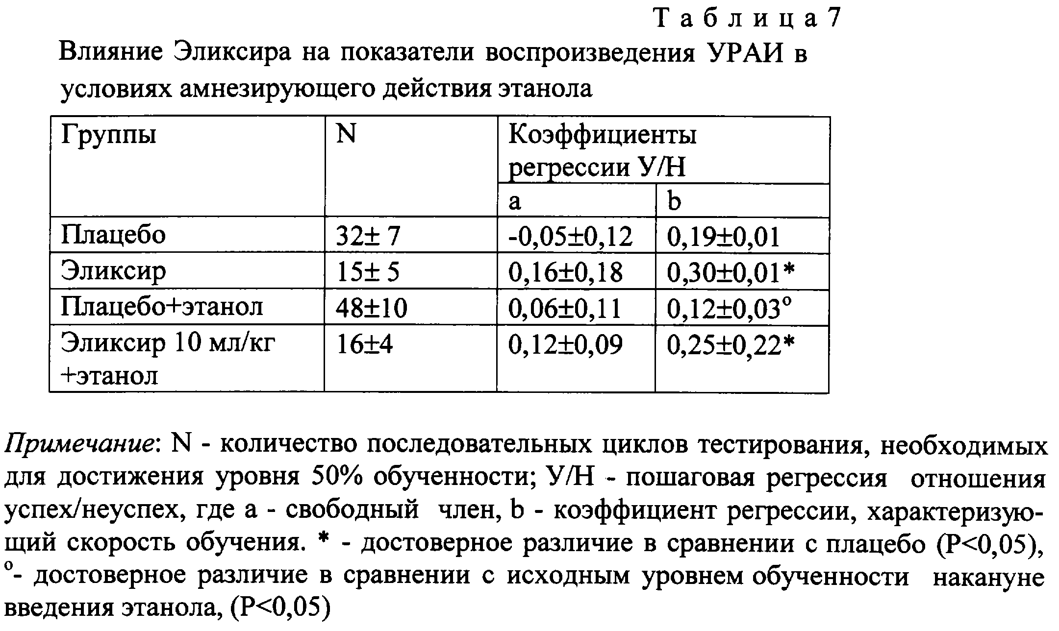Установлено, что введение этанола крысам в наркотической дозе (3 мл/кг) накануне воспроизведения выработанного УРАИ ухудшает показатели когниции, повышая в 1,5 раза количество циклов тестирования, необходимых для достижения уровня 50% обученности. Деалкоголизированный эликсир при предварительном 12-дневном назначении внутрь в дозе, соответствующей 10 мл/кг нативного препарата, полностью устраняет эффекты алкоголя, нарушающего процессы воспроизведения условных рефлексов (табл. 7).