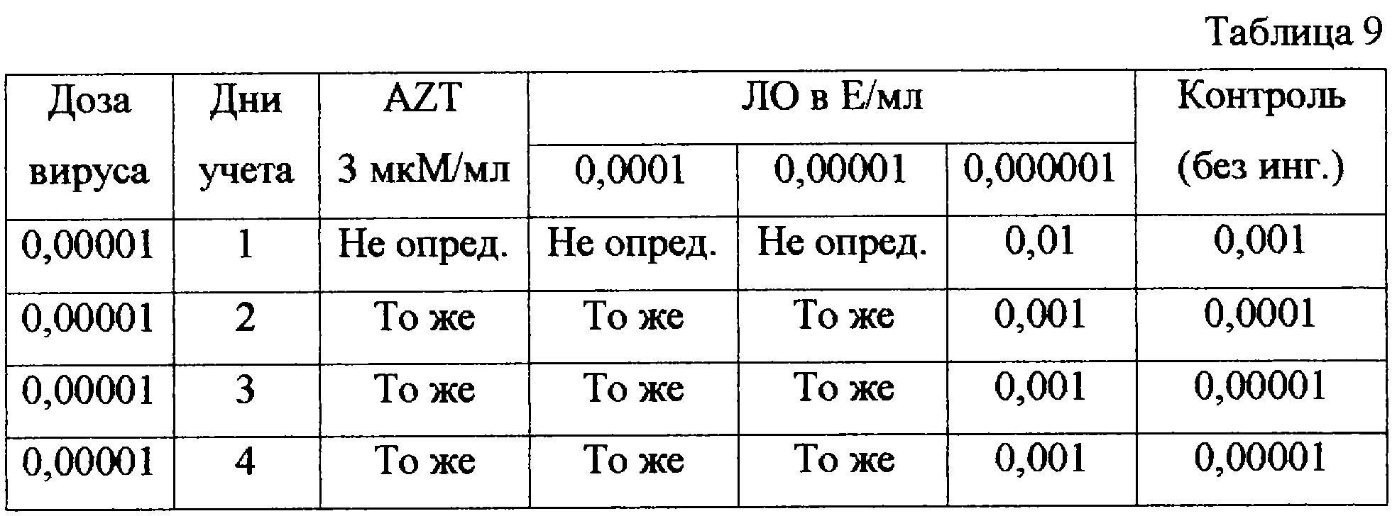 Как видно из представленных таблиц 8, 9, AZT вызывает полное подавление вируса в дозе 3 мкМ/мл, ЛО – в дозах 0,0001-0,000001 Е/мл. При более низких концентрациях ЛО уменьшение исходного титра HIV не наблюдалось. Увеличение концентрации ЛО, как видно из таблицы 8, вызывает цитотоксическое действие на клетки.