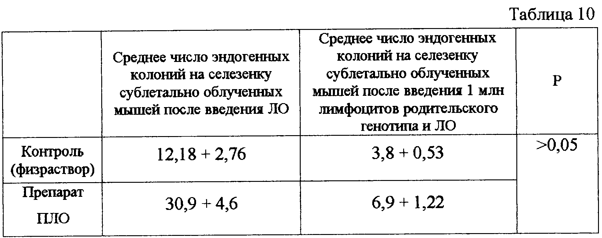 В таблице 10 представлены результаты определения иммуномодулирующей активности. Видно, что введение препарата вызывает достоверную стимуляцию КОЕ более чем на 250% (253,5%), что свидетельствует о наличии выраженных иммуномодулирующих свойств препарата ЛО. Видно также, что иммуномодулирующая активность белка сохраняется и в случае ингибированием процесса эндогенного колониеобразования клетками лимфоузлов родительского генотипа. Разница между опытом и контролем составляет 181%.