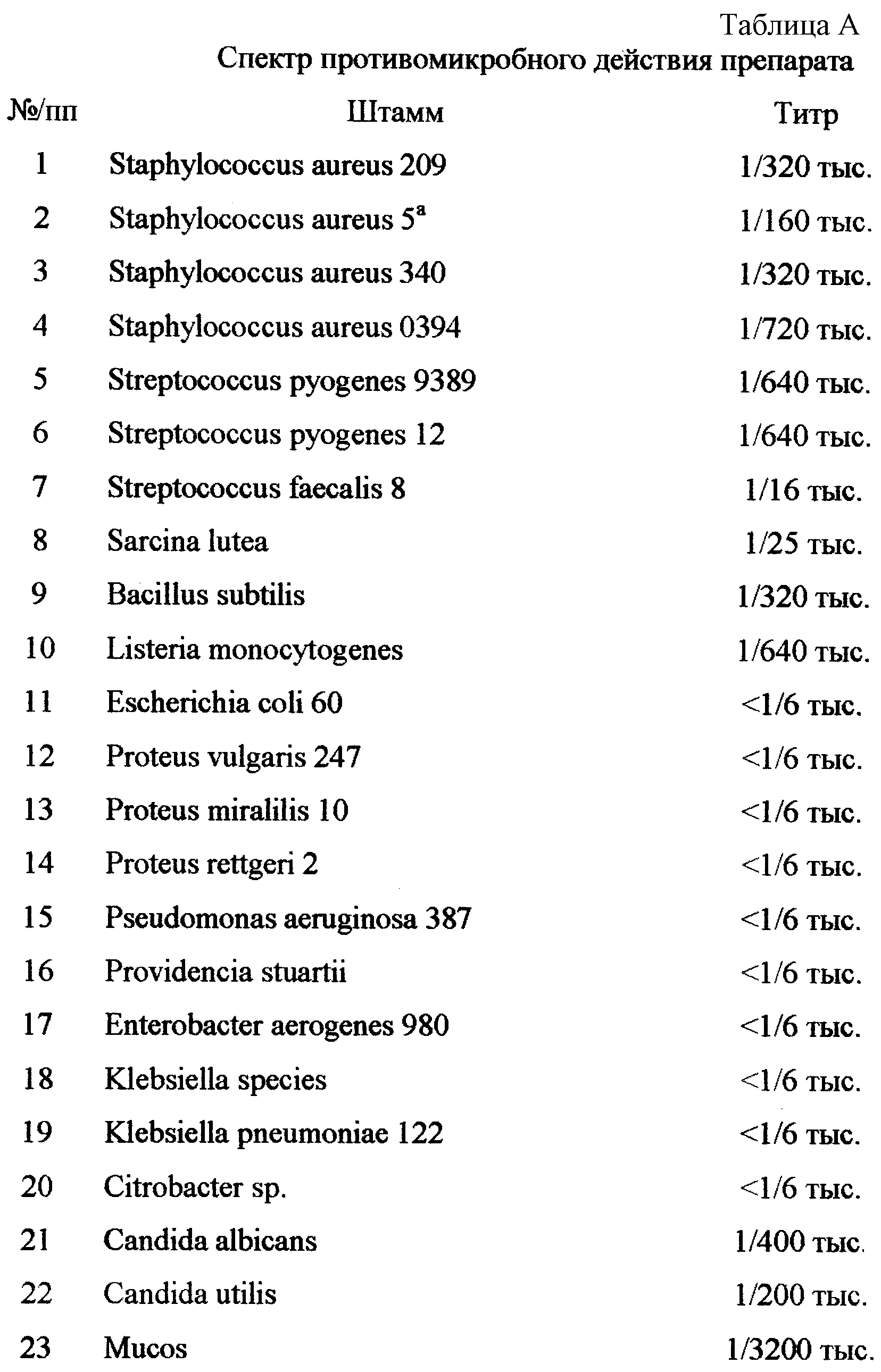 Как следует из результатов, представленных в таблице А, препарат обладает выраженным ингибирующим действием в отношении кокков. Установлено, что подавляющее действие ферментного препарата на золотистые стафилококки (штаммы 2096, 5340, 0394) имеет место при его разведении 1/160 тыс. – 1/720 тыс. Выявлено подавляющее действие на бета-гемолитические стрептококки (1/640). Энтерококк малочувствителен к воздействию препарата (1/16).