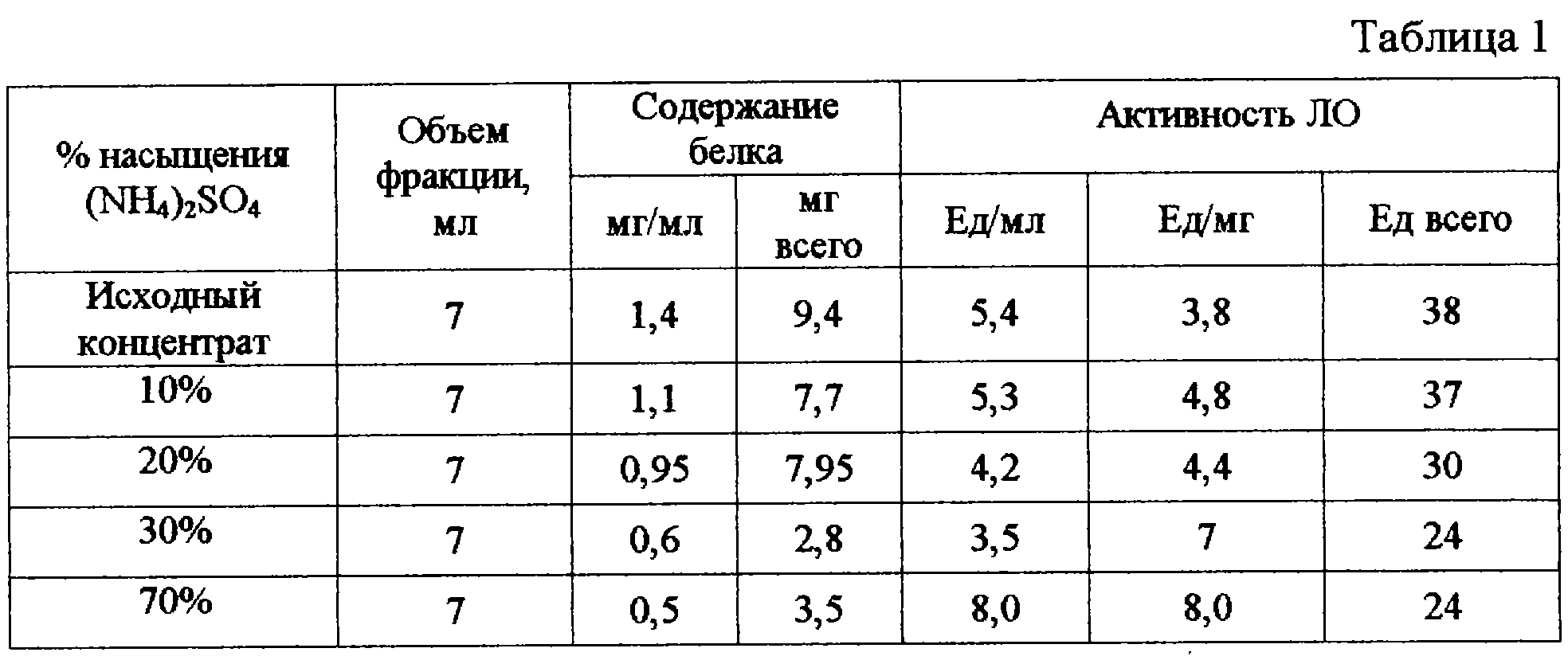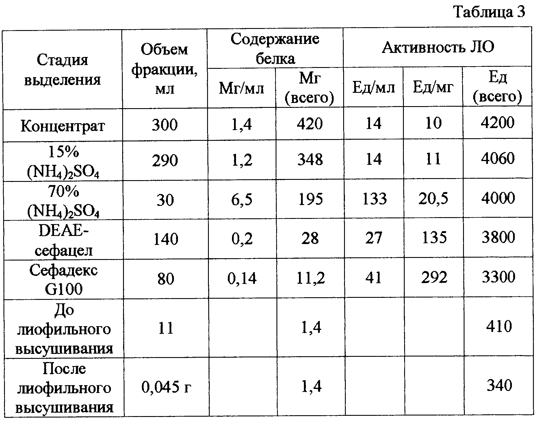Для получения ЛО используют культуральную жидкость гриба Trichoderma harzianum Rifai, депонированного в Коллекции промышленных микроорганизмов ВНИИ генетики №F180, выделение препарата проводят высаливанием белковой составляющей насыщенем исходного сырья нарастающими концентрациями (NH4)2SO4. Результаты этапов выделения показаны в таблицах 1-3.