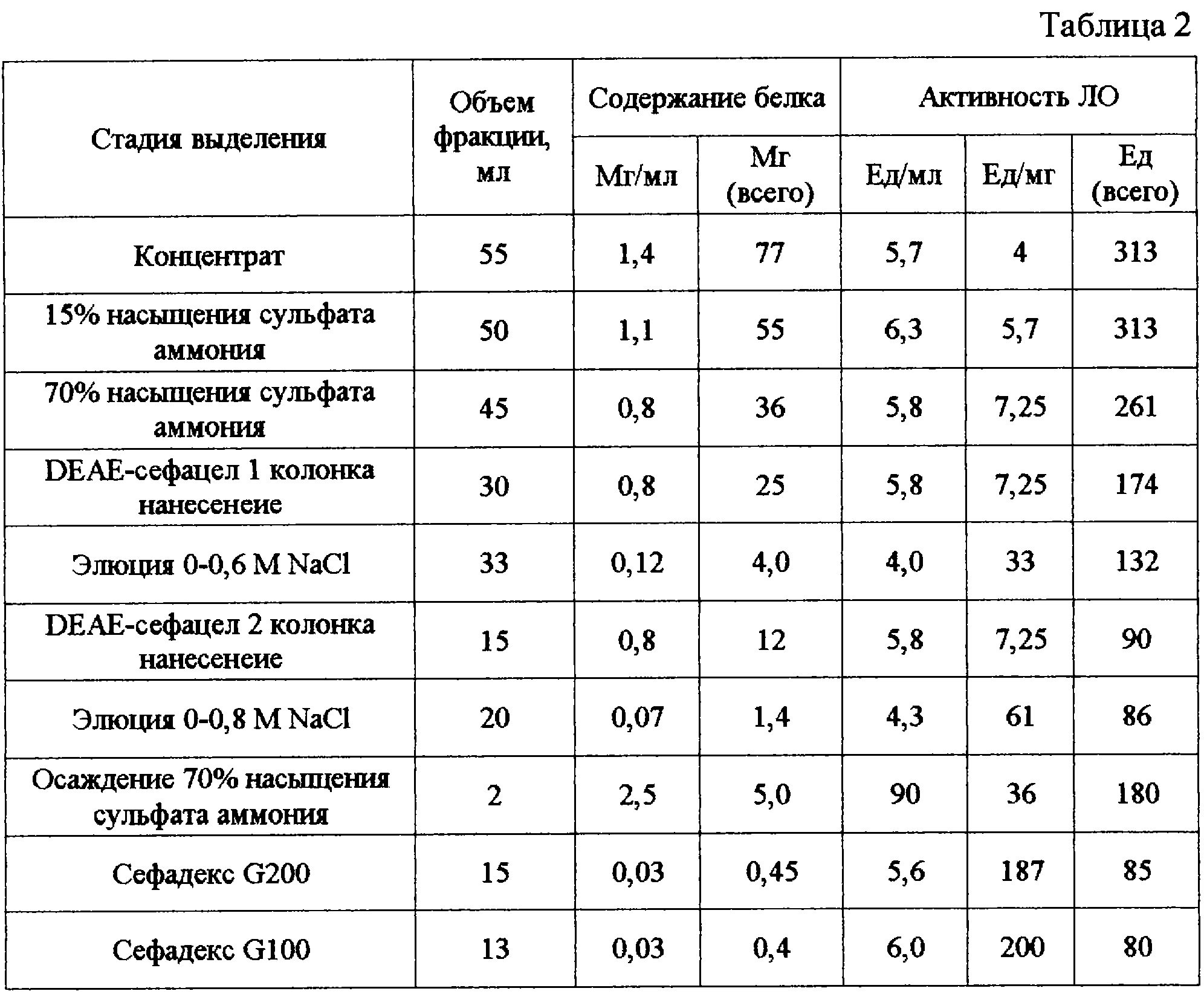 90 см. Смола уравновешена 20 мМ фосфатным буфером рН 7,4. В полученных фракциях определяли активность лизиноксидазы и фракции объединяли. Вторую порцию наносили на колонку с сефадексом G200. Результаты выделения и очистки фермента представлены в таблице 2. Как видно из таблицы, удельная активность фермента повысилась от 4 до 200 ед/мг. Также показано, что для очистки можно использовать сефадекс G100.