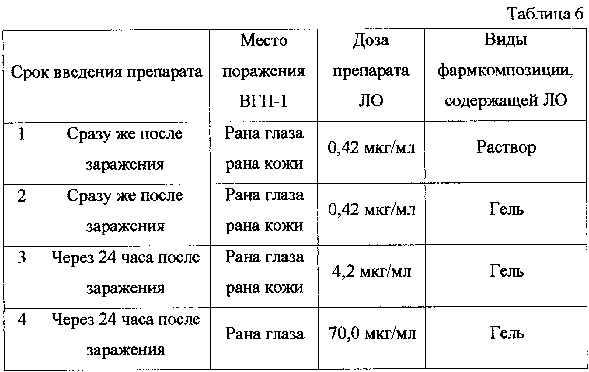 Схемы лечения животных препаратом ЛО в виде раствора и геля суммированы в таблице 6.