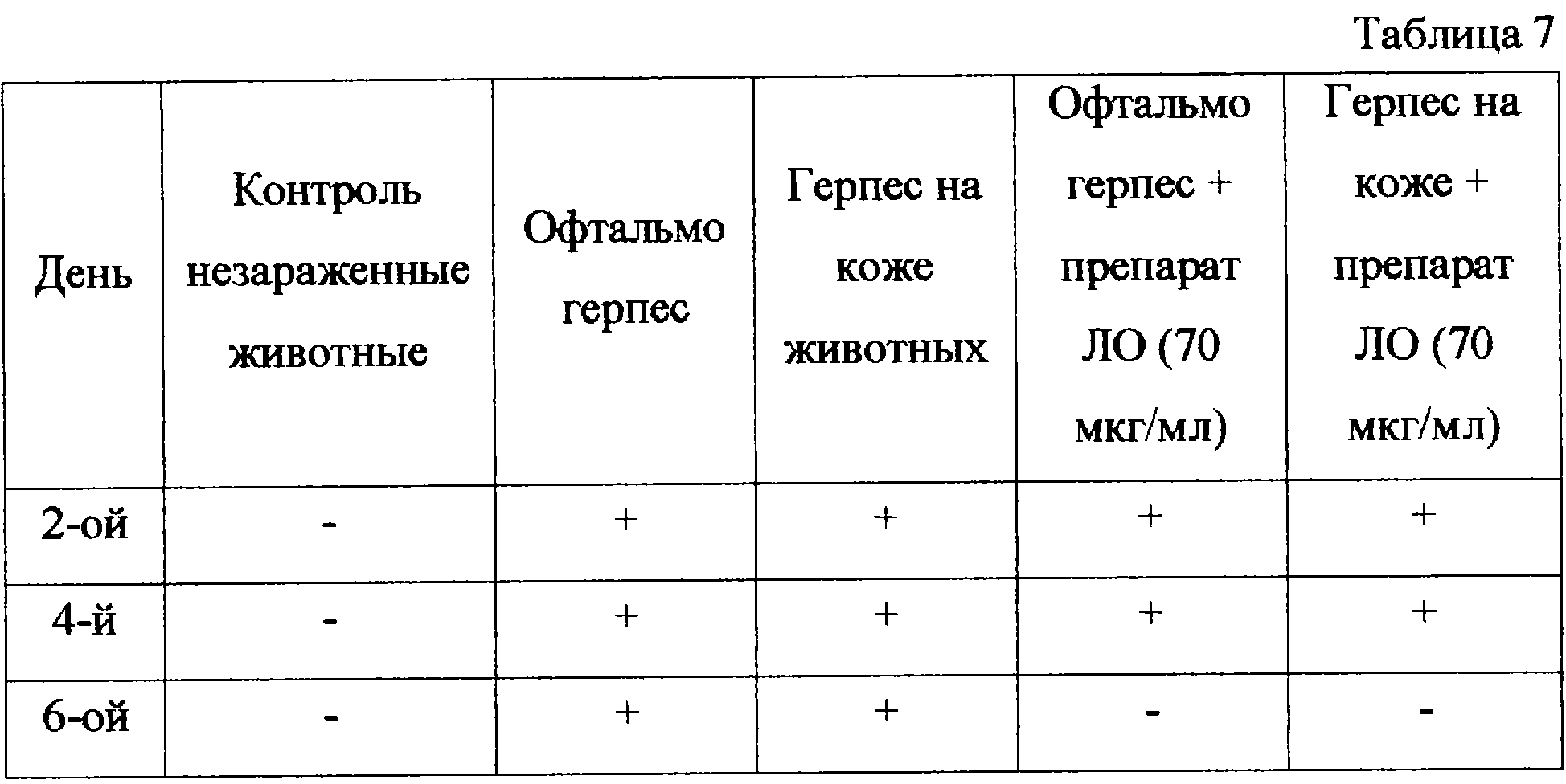 Результаты иммунологического анализа совпадали с характером морфологических изменений, выявленных при лечении герпетических поражений глаз и кожи. Эти результаты представлены в таблице 7, из которой следует, что торможение вирусспецифических белков в пораженных ВГП-1 участках кожи несколько слабее по сравнению с офтальмогерпесом, но к шестому дню экспрессия вирусных антигенов в соскобах глаз и кожи лабораторных животных отсутствует. Кроме того, не было зарегистрировано токсического и аллергического действия гелевой формы при втирании в кожу и глаза здоровых животных.