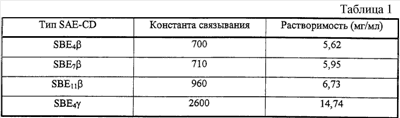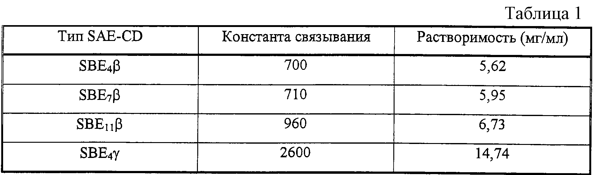 К различным производным SAE-CD, которым давали оценку, относятся SBE4 , SBE7 , SBE11 и SBE4 , соответствующие производным SAE-CD формулы I, где n=5, 5, 5 и 6; m равен 4; и присутствуют соответственно сульфоалкилэфирные заместители 4, 7, 11 и 4. Обнаружено, что указанные производные SAE-CD повышают растворимость лекарственных средств, плохо растворимых в воде, до различной степени. Например, в табл.1 сведены данные по константе связывания и растворимости, полученные в случае некоторых SAE-CD (0,1 М при 25°С) и метилпреднизолона.
