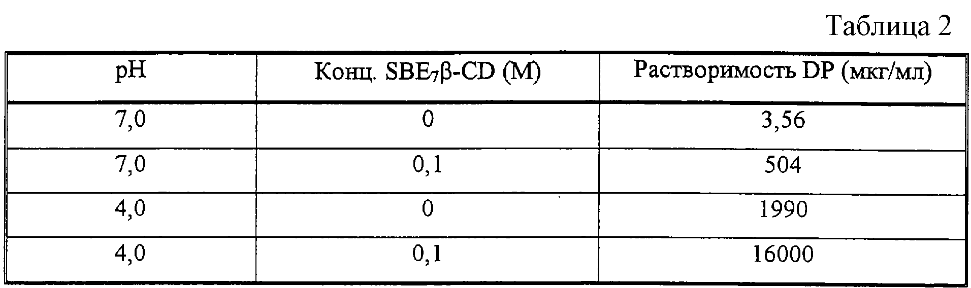 В другом варианте воплощения изобретения используют дипиридамол (DP), являющийся лекарственным средством основного характера (pka=6,28) с плохой водорастворимостью своего свободного основания (3,6 мкг/мл при 25°С) и низкой и изменчивой биологической доступностью. Обнаружено, что SBE7 -CD заметно повышает растворимость DP. В табл.2 приводятся данные по растворимости DP в присутствии и в отсутствие SBE7 -CD при разных значениях рН.
