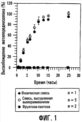 Фиг.1. Профили высвобождения для препаративных форм, содержащих метилпреднизолон и SBE7 -CD.
