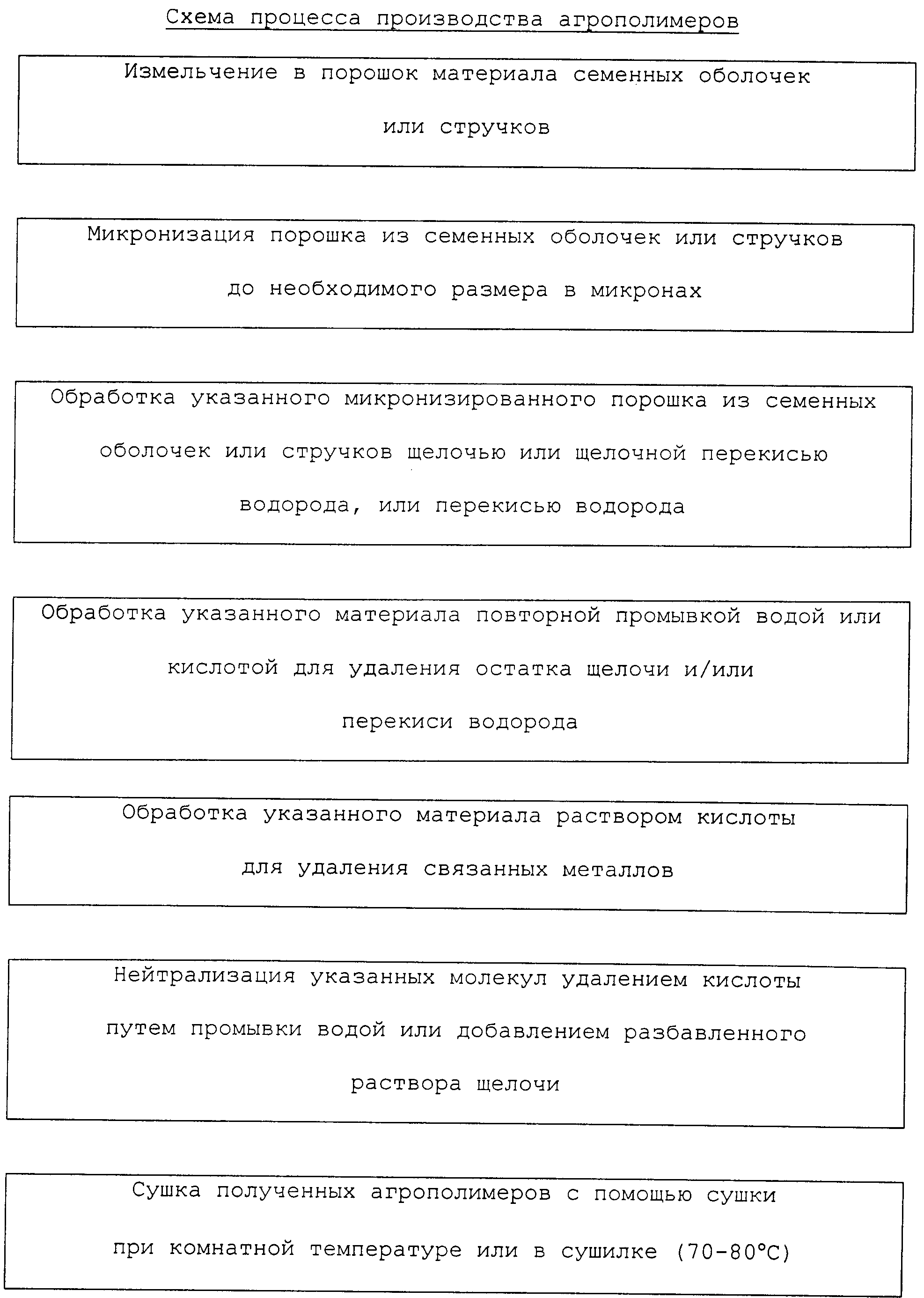 Обработка щелочью без перекиси водорода также дает агрополимеры удалением металлов, особенно при получении агрополимеров из злаков и проса. Микронизированные семенные оболочки или стручки смешивают со щелочью (такой, как гидроокись натрия или гидроокись калия). Обработку щелочью осуществляют либо добавлением раствора щелочи к микронизированному порошку из семенных оболочек или стручков или добавлением порошка/хлопьев щелочи непосредственно к микронизированному порошку из семенных оболочек или стручков с последующим позднее добавлением воды. Обработка щелочью высвобождает вещества темного коричневато-желтого цвета из семенных оболочек или стручков, которые по своей природе являются водорастворимыми. Более низкий процент щелочи (5-7,5%) требует больше времени задерживания для удаления данных темных коричневато-желтых веществ из семенных оболочек или стручков, в то время как более высокий процент щелочи (20-25% раствор) удаляет темные коричневато-желтые вещества в течение 3-4 часов. Щелочь удаляется повторной промывкой водой или добавлением раствора кислоты (такой, как НСl или 2SO4). Связанные металлы из полученных веществ удаляют обработкой минеральными кислотами, включая серную, азотную или соляную (1-3%). Полученный материал нейтрализуют повторной промывкой водой или добавлением необходимого количества 1 М раствора щелочи (такой, как NaOH, КОН). Материал после удаления супернатанта сушат при комнатной температуре или в сушилке (70-80 С). Чем меньше размер, тем лучше свойства удаления металлов или ионов.