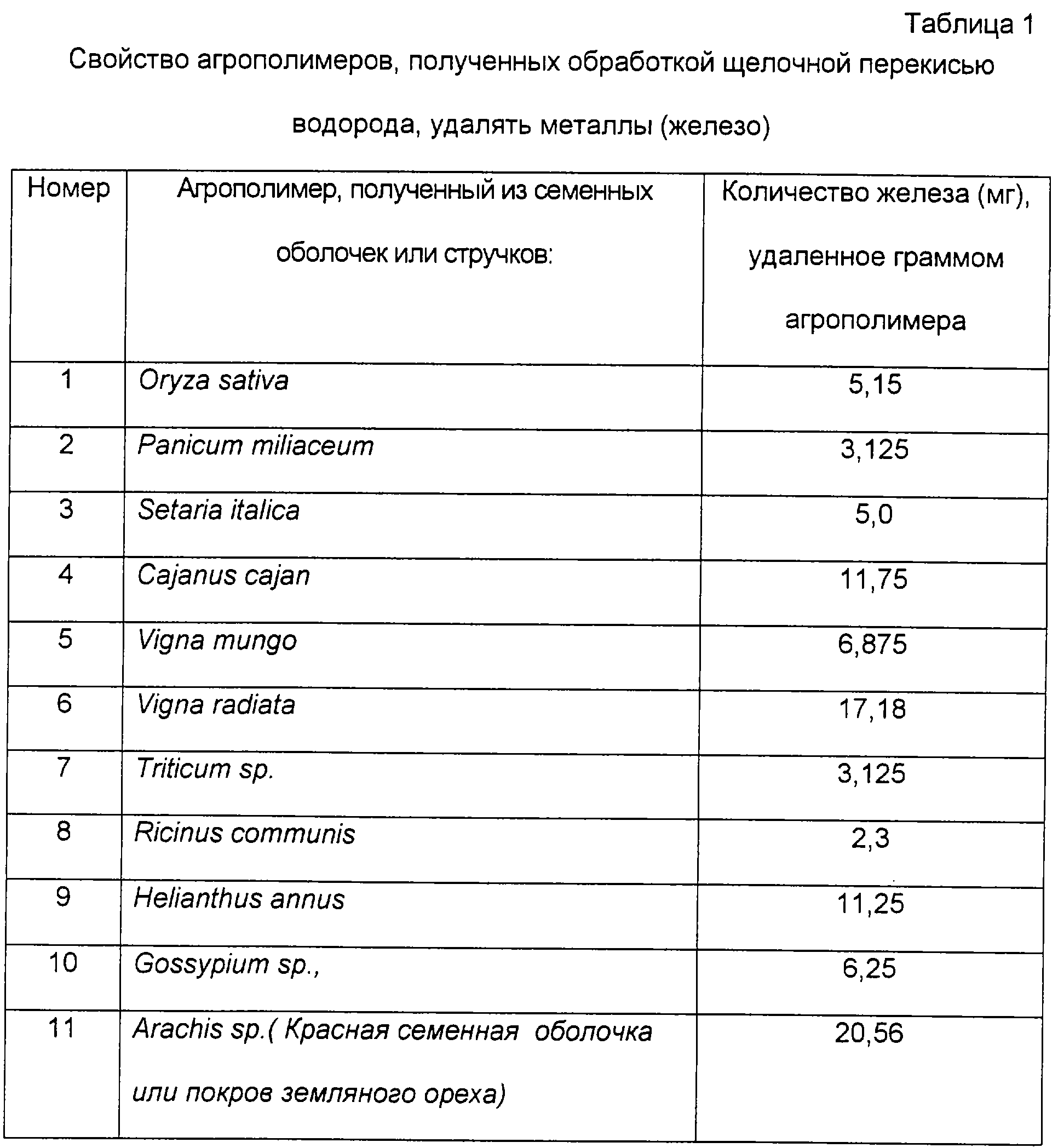 В таблице 1 показано свойство удалять металлы (железо) агрополимеров, полученных из Oryza sativa, Panicum miliaceum, Setaria italica, Cajanus cajan, Vigna mungo, Vigna radiata, Triticum sp., Ricinus communis, Helianthus annus, Gossypium sp., Arachis sp. обработкой щелочной перекисью водорода. Раствор хлористого железа (3) пропускали через грамм агрополимера в колонке со скоростью потока 2 мл в мин и содержание связанного металла определяли элюированием 2-5% соляной кислотой. Перед элюированием несвязанный избыточный металл удаляли с колонки промывкой раствором соляной кислоты с рН 2,5. Связанный металл определяли спектрофотометрически при 535 нм, используя пар-реагент.