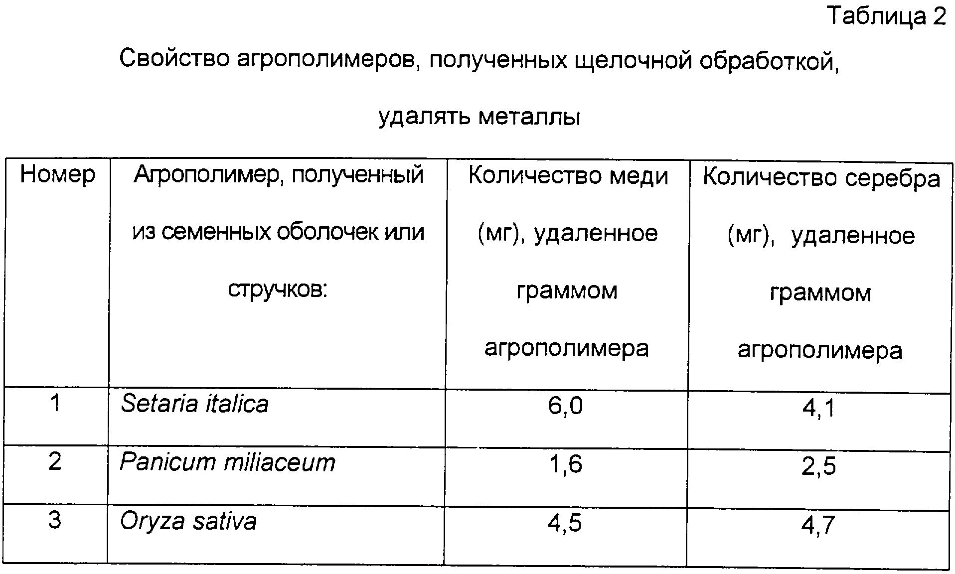 В таблице 2 показано свойство удалять металлы агрополимеров, полученных из семенных оболочек или стручков, с помощью щелочной обработки Setaria italica, Panicum miliaceum и Oryza sativa, удаляли медь и серебро.