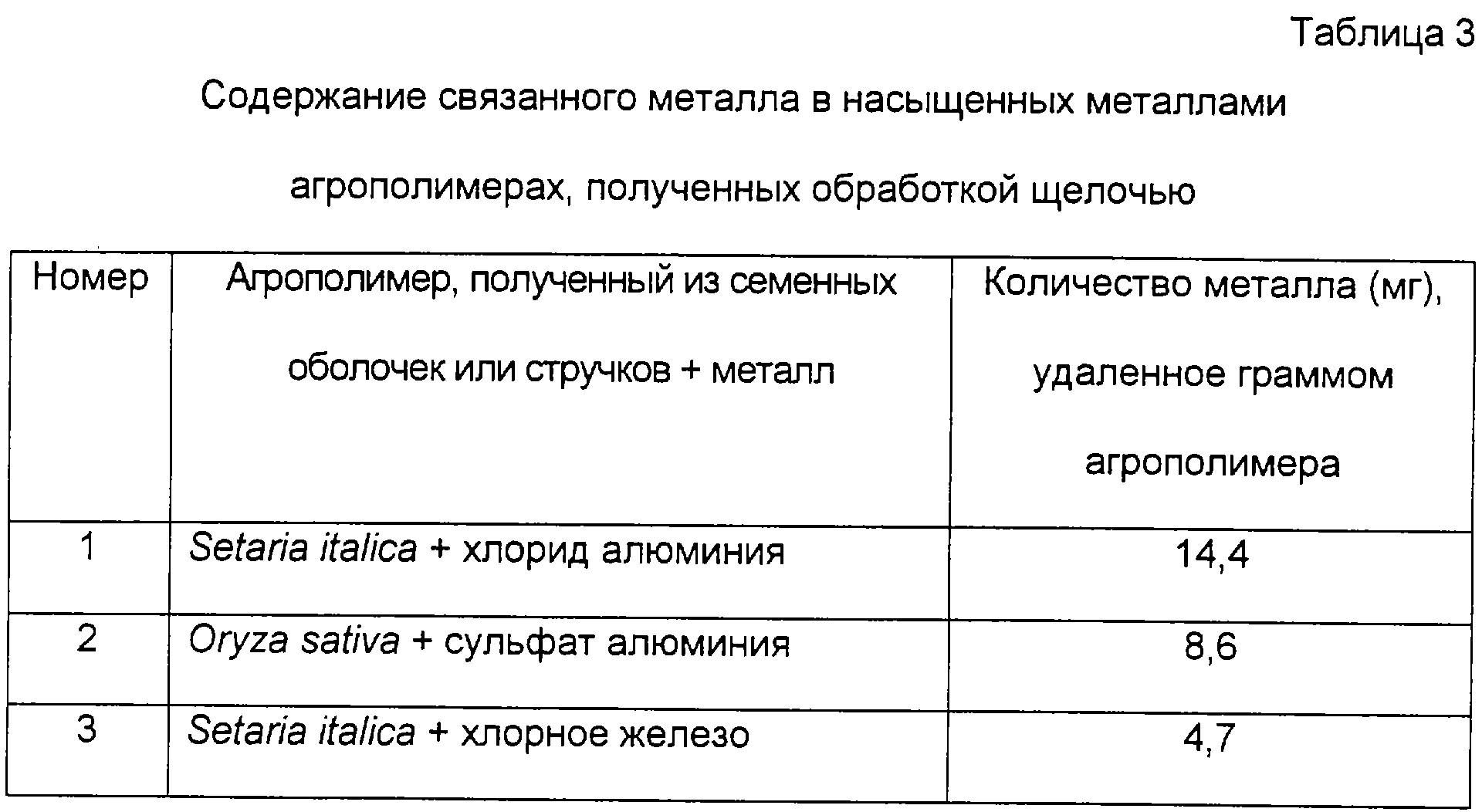 В таблице 3 показано насыщение металлами (алюминием и железом) агрополимеров, полученных из семенных оболочек или стручков Setaria italica и Oryza sativa.