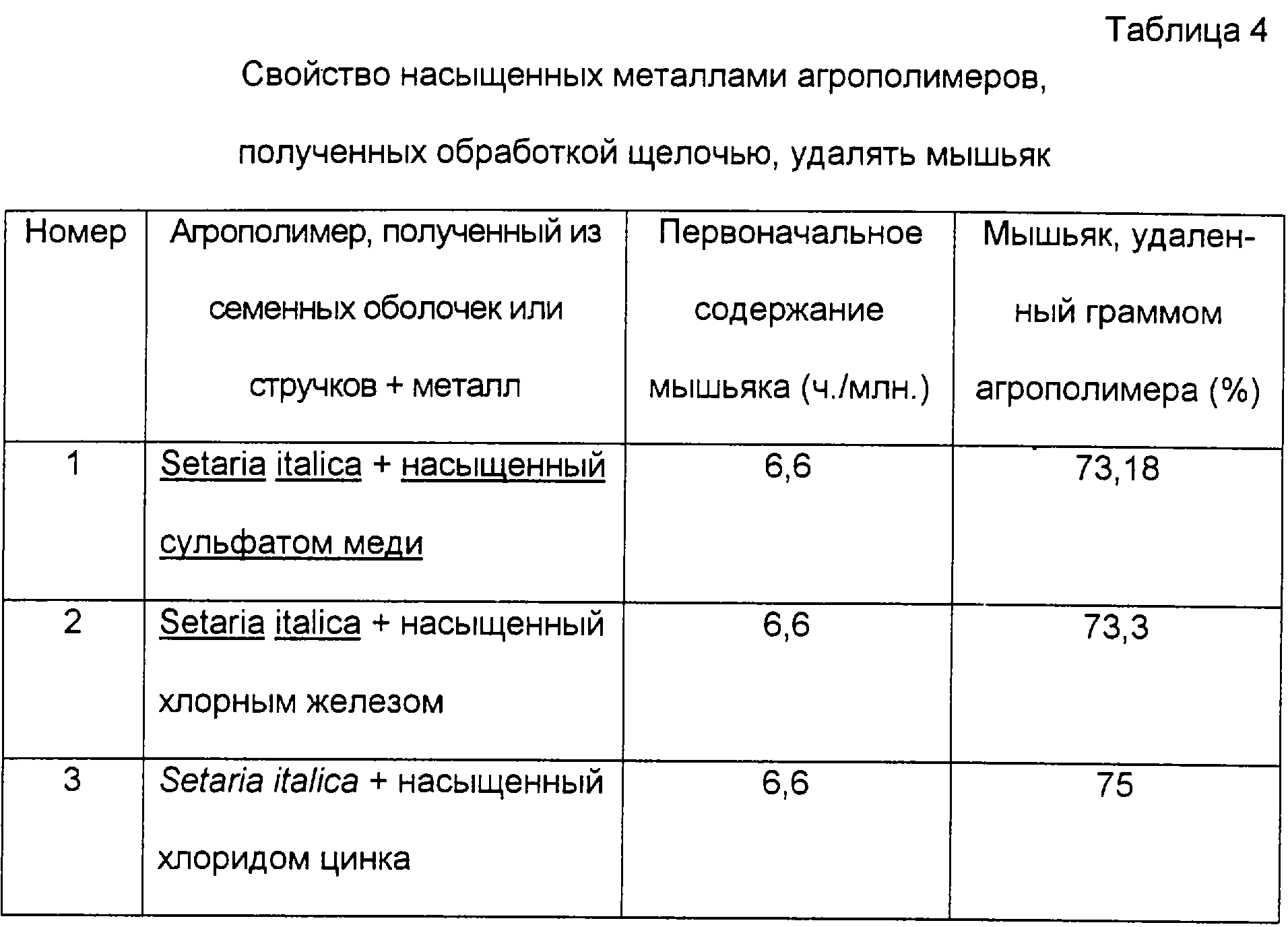 В таблице 4 показано свойство насыщенного металлом агрополимера удалять мышьяк (агрополимера, насыщенного медью, железом, цинком, полученного из семенных оболочек или стручков Setaria italica).