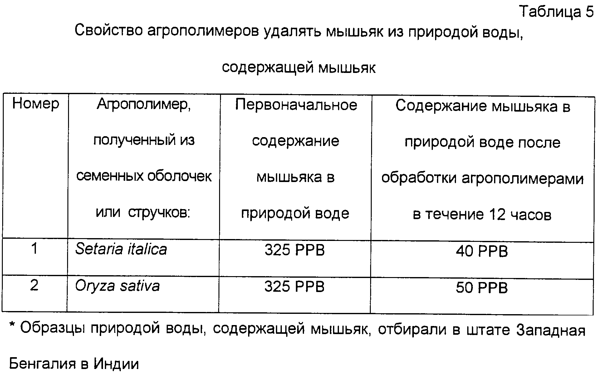 Агрополимеры без пропитки металлом также абсорбируют мышьяк. Как показано в таблице 5, агрополимеры значительно снижали содержание мышьяка в естественных водах, содержащих мышьяк.