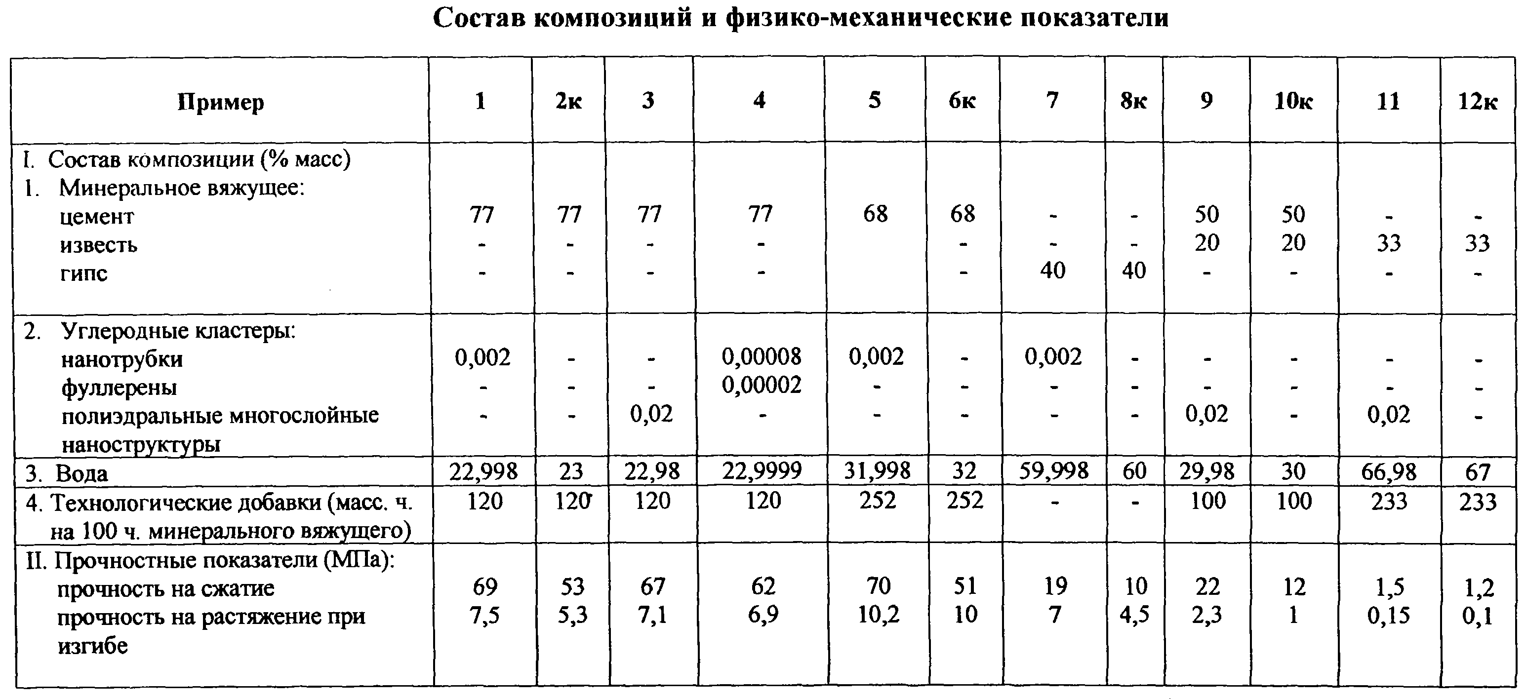 Формула изобретения 1. Композиция для получения строительных материалов на основе минерального вяжущего, включающая минеральное вяжущее, выбранное из группы, включающей цемент, известь, гипс или их смеси, и воду, отличающаяся тем, что она дополнительно содержит углеродные кластеры фуллероидного типа с числом атомов углерода 36 и более при следующем соотношении компонентов в композиции, мас.%: Минеральное вяжущее 33-77 Углеродные кластеры фуллероидного типа 0,0001-2,0 Вода Остальное 2. Композиция по п.1, отличающаяся тем, что в качестве углеродных кластеров фуллероидного типа она содержит полидисперсные углеродные нанотрубки. 3. Композиция по п.1, отличающаяся тем, что в качестве углеродных кластеров фуллероидного типа она содержит полиэдральные многослойные углеродные наноструктуры с межслоевым расстоянием 0,34-0,36 нм и размером частиц 60-200 нм. 4. Композиция по п.1, отличающаяся тем, что в качестве углеродных кластеров фуллероидного типа она содержит смесь полидисперсных углеродных нанотрубок и фуллерена C60. 5. Композиция по п.1, отличающаяся тем, что она дополнительно содержит технологические добавки, взятые в количестве 100-250 мас.ч. на 100 мас.ч. минерального вяжущего. РИСУНКИ