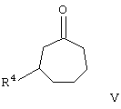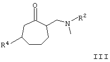 в которой R4 имеет значения, указанные выше, взаимодействием с аминами общей формулы HN(CH3)R2 (необязательно в виде их солей) и параформальдегидом, соответственно водным раствором формальдегида в растворителях, таких как вода, спирты или уксусная кислота, при температурах в интервале от 20 С до температуры кипения растворителя. Предпочтительно, однако, получать соединения общей формулы III взаимодействием циклогептанонов V с галогенидами метилениммония общей формулы H2C=N(CH3)R2X, где R2 имеет значения, указанные выше, а Х обозначает атом хлора либо иода, в растворителях, таких как ацетонитрил или тетрагидрофуран, при температурах в интервале от 20 до 50 С.