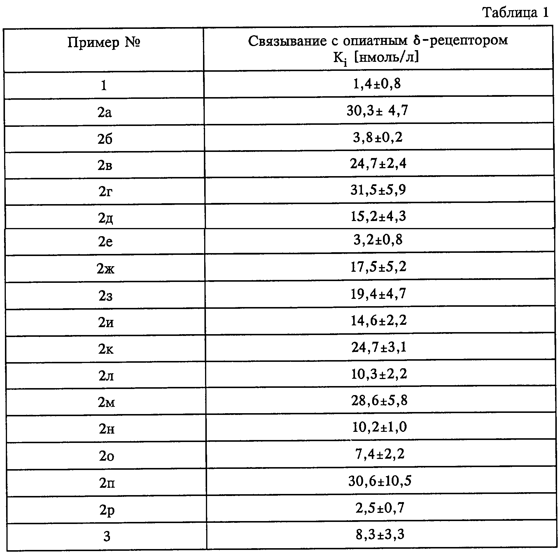 Сродство соединений по изобретению к опиатному -рецептору рассчитывали в виде показателя IC50 согласно закону действующих масс методом нелинейной регрессии. Ki-значения в таблице 1 указаны в качестве средних значений ± стандартные отклонения по 3 проведенным независимо друг от друга опытам.