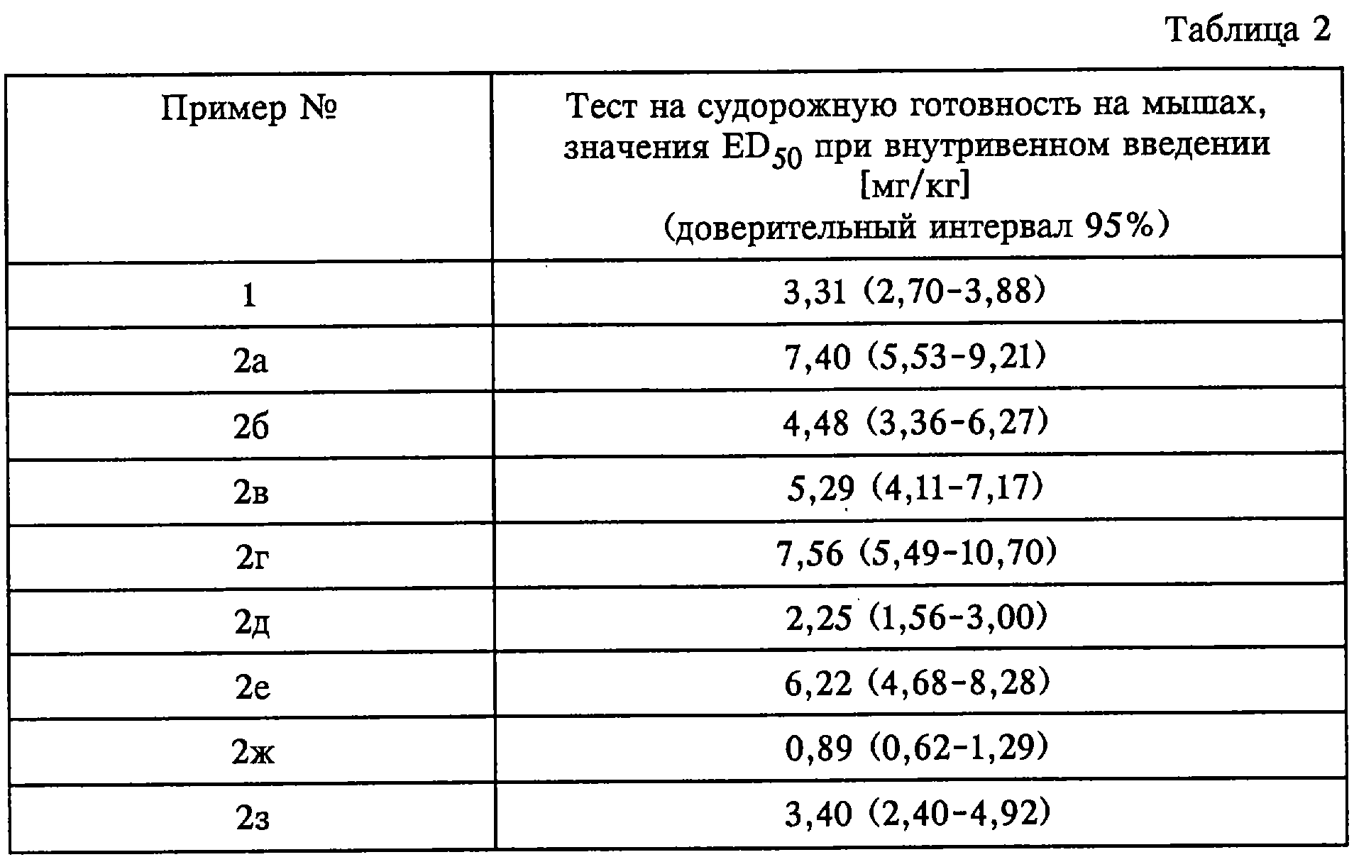 Ki полученного соединения имеет значение 36,50 нмоль/л. В опытах in vivo (мыши, тест на судорожную активность, табл.2) показывает ED50=4,00 мг/кг.