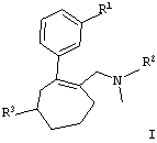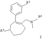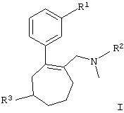 Как было установлено, указанным требованиям отвечают замещенные циклогептеновые соединения общей формулы I. В соответствии с этим объектом настоящего изобретения являются новые замещенные циклогептены общей формулы I