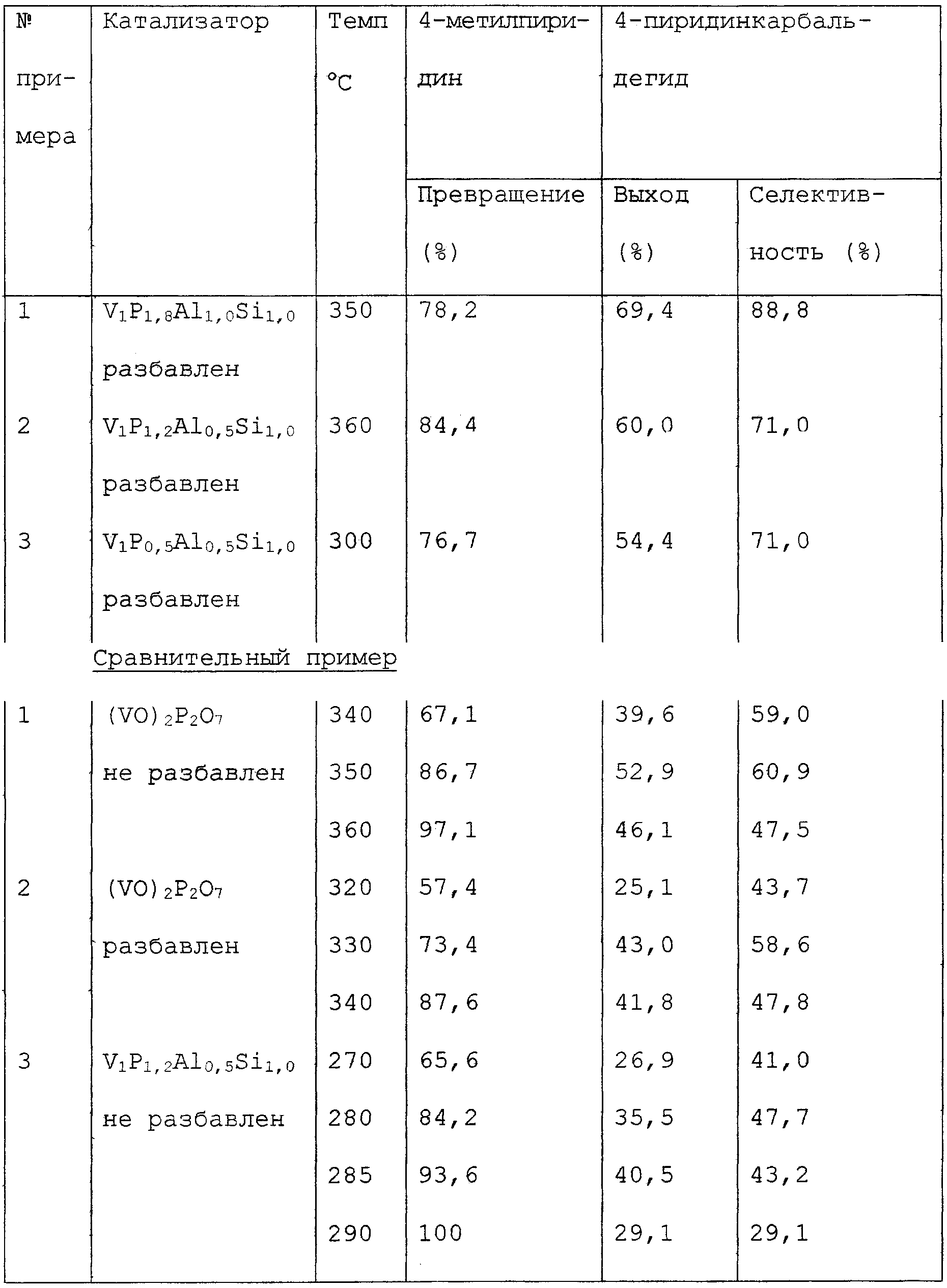 4-Пиридинкарбальдегид получают с использованием оксида в качестве катализатора. Размер зерен оксида, имеющего атомное отношение без кислорода V1P1,2Al0,5Si1,0, делают однородным от 1,0 до 1,7 мм (от 10 до 16 меш). Реакторную трубку из пирекса, имеющую внутренний диаметр 18 мм, заполняют 5 мл оксида, имеющего однородный размер зерен, и далее заполняют 5 мл имеющего однородный размер зерен этого оксида, разбавленного 5 мл карбида кремния, имеющего такой же размер зерен. Отношение при заполнении в реакторной трубке оксида к карбиду кремния (отношение по массе) составляет от 1 до 0,62. Часть реакторной трубки, заполненной катализатором, нагревают до 350 С. Для проведения реакции смешанный газ, содержащий 4-метилпиридин, воду и воздух (молярное отношение в смеси 4-метилпиридин:вода:воздух = 1:30:10), подают из верхнего отверстия реакторной трубки при SV = 1940 ч-1. Прореагировавший газ, выходящий из реакторной трубки, барботируют в 100 мл воды в течение 10 минут для сбора продукта реакции, находящегося в прореагировавшем газе. Полученную собирающую жидкость анализируют газовой хроматографией. Результаты приводятся в таблице.