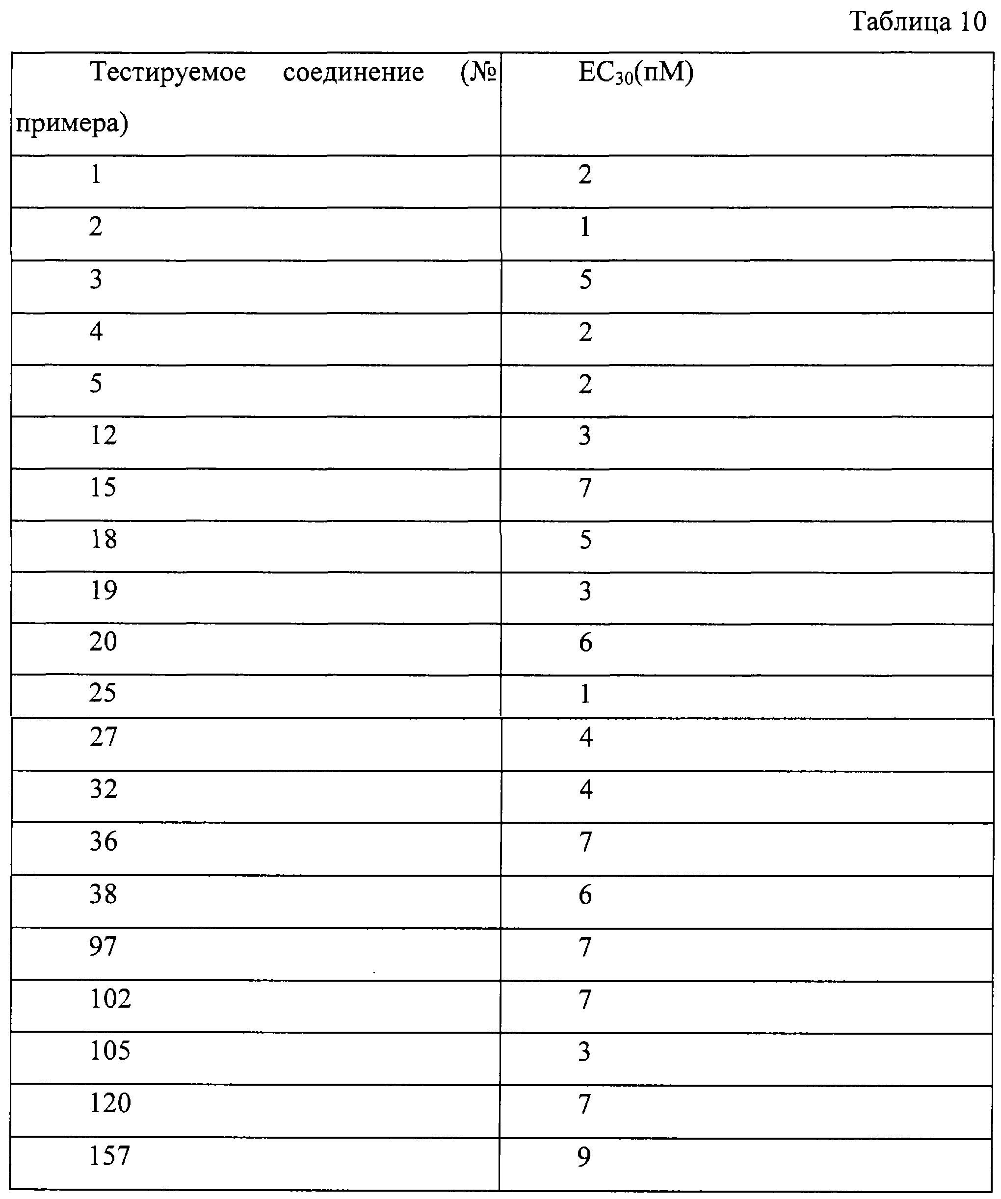Образец сокращается под действием фенилэфрина. После сокращения образцов, ставших непрерывной фазой, кумулятивно добавляют испытываемое соединение в количестве 0,1, 1, 10, 100 и 1000 нМ с интервалом 30 минут. Наконец, добавляют папаверин (100 мкМ), с помощью которого определяют максимальную реакцию релаксации. Степень релаксации от испытываемых соединений при каждой концентрации вычисляют, основываясь на максимальной релаксации под действием папаверина (100 мкМ), которую принимают за 100%. Степень релаксации испытываемого соединения оценивают как ЕС30 (т.е. количество (нМ) испытываемого соединения, при котором наблюдают степень релаксации в 30% от релаксации в случае папаверина). Результаты показаны в таблице 10.