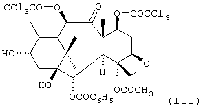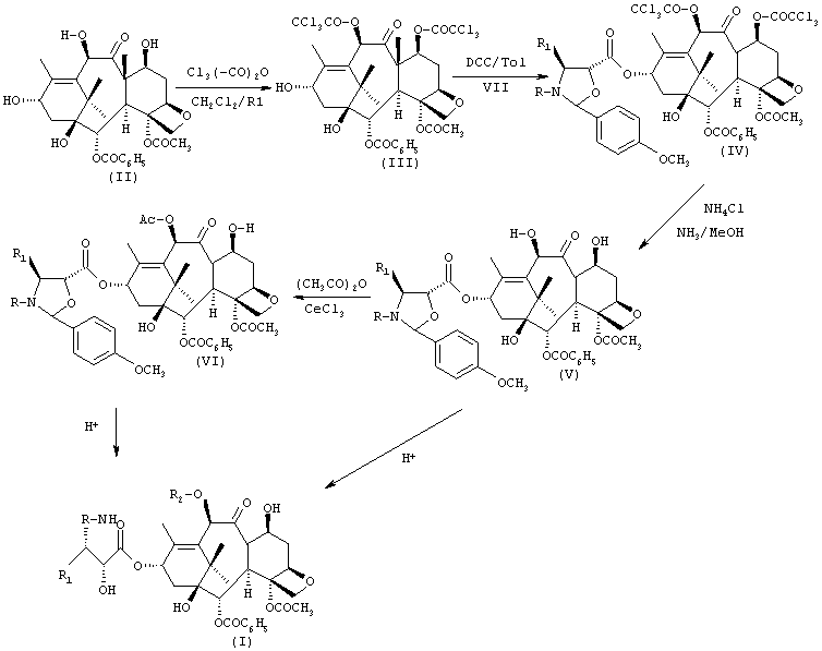где R означает трет-бутоксикарбонил, бензоил или остаток прямой или разветвленной алифатической кислоты, R1 означает фенил или прямой или разветвленный алкил или алкенил и R2 означает водород или ацетил, который включает: а) одновременную защиту гидроксильных групп в положениях 7 и 10 10-деацетилбаккатина III трихлорацетильными производными с получением соединения формулы III: