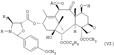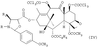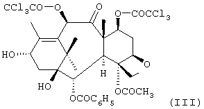 17 г 7,10-бистрихлорацетил-10-деацетилбаккатина III растворяют в 250 мл безводного толуола и добавляют при перемешивании к 12,6 г 2-(4-метоксифенил)-N-бензоил-4-фенилоксазолидин-5-карбоновой кислоты и 6 г DCC (дициклогексилкарбодиимид). После перемешивания в течение ночи при 40°С реакционную смесь фильтруют и концентрируют досуха. Остаток растворяют в 300 мл смеси метанол/тетрагидрофуран и добавляют к 24 мл 2 М водного раствора NН3. После 1,5 часов при комнатной температуре реакционную смесь концентрируют до небольшого объема в вакууме, затем разбавляют водой и весь полученный объем экстрагируют этилацетатом. Экстракт концентрируют досуха, и остаток очищают на колонке с силикагелем, элюируя продукт смесью этилацетат/петролейный эфир 1:1, получая 16,8 г указанного в заглавии продукта с т. пл. 135 С и [ ]D=-58 (МеОН, С=0,5).