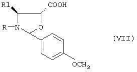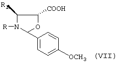 Доказано, что выбор анисового альдегида особенно важен для образования оксазолидина, поскольку оксазолидиновая кислота, в противоположность способам, описанным в патентах США 5621121, 5637723 (Rhone-Poulenc Rorer) и 5821363 (Up John), легко может быть выкристаллизована и доведена до соотношения изомеров 95:5, которое чрезвычайно полезно и выгодно для последующей стадии. Кроме того, оксазолидинкарбоновая кислота, получаемая с анисовым альдегидом, особенно стабильна во время снятия защиты трихлоруксусного эфира и последующей стадии ацетилирования. В указанных условиях 2,4-диметоксибензальдегид, используемый в патенте США 5821363, либо хлораль или п-трихлорметилбензальдегид, описанные в патентах США 5621121 и 5637723 (Rhone-Poulenc Rorer), недостаточно стабильны.