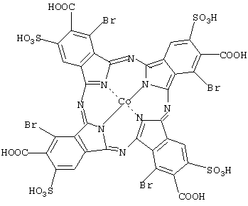 Поставленная задача решена синтезом тетра(3-бром-4-карбокси-5-сульфо)фталоцианина кобальта