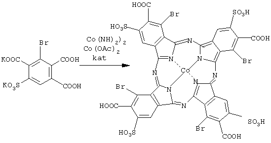 – тетра(3-бром-4-карбокси-5-сульфо)фталоцианин кобальта обладает растворимостью как в щелочных, так и в нейтральных и слабокислых водных средах, что позволяет использовать его для окрашивания хлопчатобумажных волокон и тканей из них в сине-зеленый цвет, расширяя цветовую гамму водорастворимых фталоцианиновых красителей;