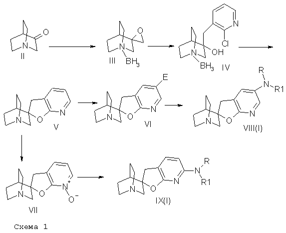 В приведенных ниже схемах реакций и тексте R и R1, если не указано иначе, имеют значения, указанные выше для формулы I. Соединение формулы VIII представляет собой соединение формулы I, где NRR1 присоединен в 5-положении кольца фуропиридина. Соединение формулы IX представляет собой соединение формулы I, где NRR1 присоединен в 6-положении кольца фуропиридина. А представляет N; Е представляет галоген, NO2 или NHR. Соединения формулы I можно получить по способам, указанным в схеме 1.