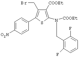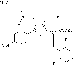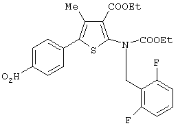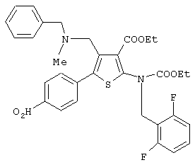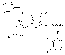 Соединение (V) может быть получено любым известным по существу способом, например, взаимодействием п-нитрофенилацетона со сложным эфиром циануксусной кислоты и серой [например. Chem. Ber., 99, 94-100 (1966)] и последующей реакцией полученного таким образом 2-амино-4-метил-5-(4-нитрофенил)тиофена по способу, раскрытому в JP-A-169768, WO 96/24597, или по способу, аналогичному указанным способам.