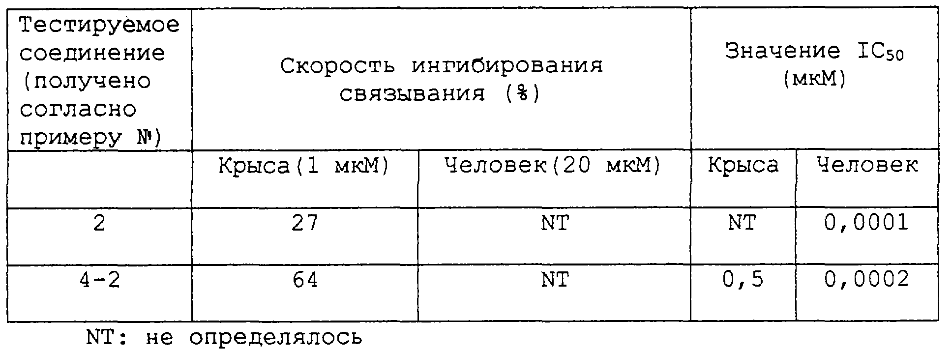 Для того чтобы определить скорость ингибирования связывания для каждого из добавляемых соединений, рассчитывали значение выражения (TB-SB)/(TB-NSB) 100 (где SB = радиоактивность с добавленным соединением, ТВ = максимум радиоактивности при связывании, NSB = максимум радиоактивности при неспецифическом связывании). Кроме того, определяли скорость ингибирования при варьировании концентрации тестируемого соединения и рассчитывали значение концентрации 50% ингибирования (значение IС50) из графика Хилла. Результаты приведены ниже.