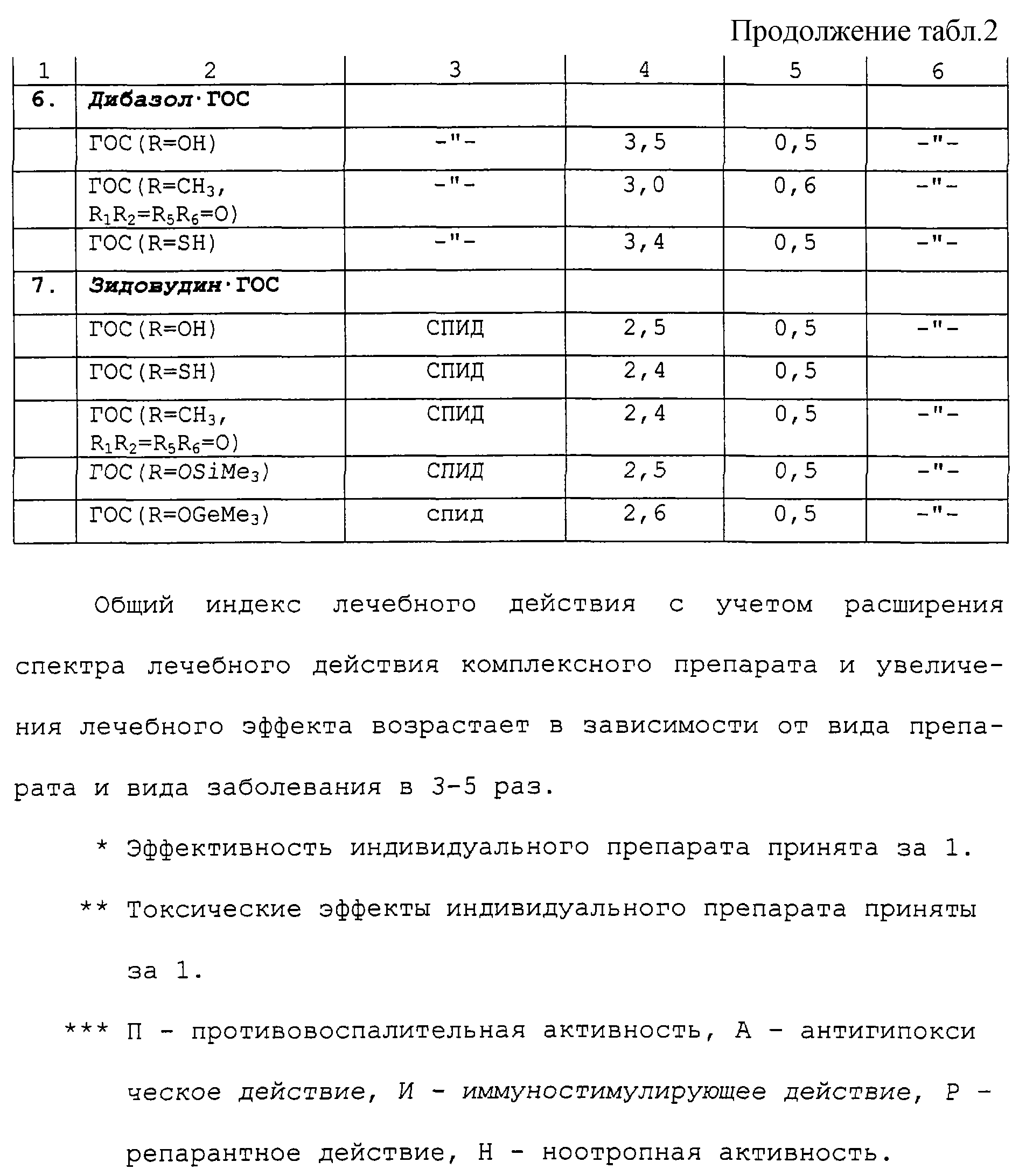 Правая часть фиг.1 относится к действию комплекса применяемого лекарственного препарата с германийорганическим соединением (ГОС). Лечебное действие комплекса с ГОС значительно повышено, что иллюстрировано областью 3, а токсическое действие 4 понижено. Более того, появляются другие терапевтические эффекты 6а (Антигипоксический эффект), 6b (Иммунопотенциирующий), 6с (Противовоспалительный эффект), 6d (Репарантный эффект) и 6е (Ноотропный эффект). Все области, отмеченные крестиками, относятся к увеличению лечебного действия, заявляемого в настоящем изобретении. Дополнительное описание этого эффекта приводится ниже в последующих разделах.