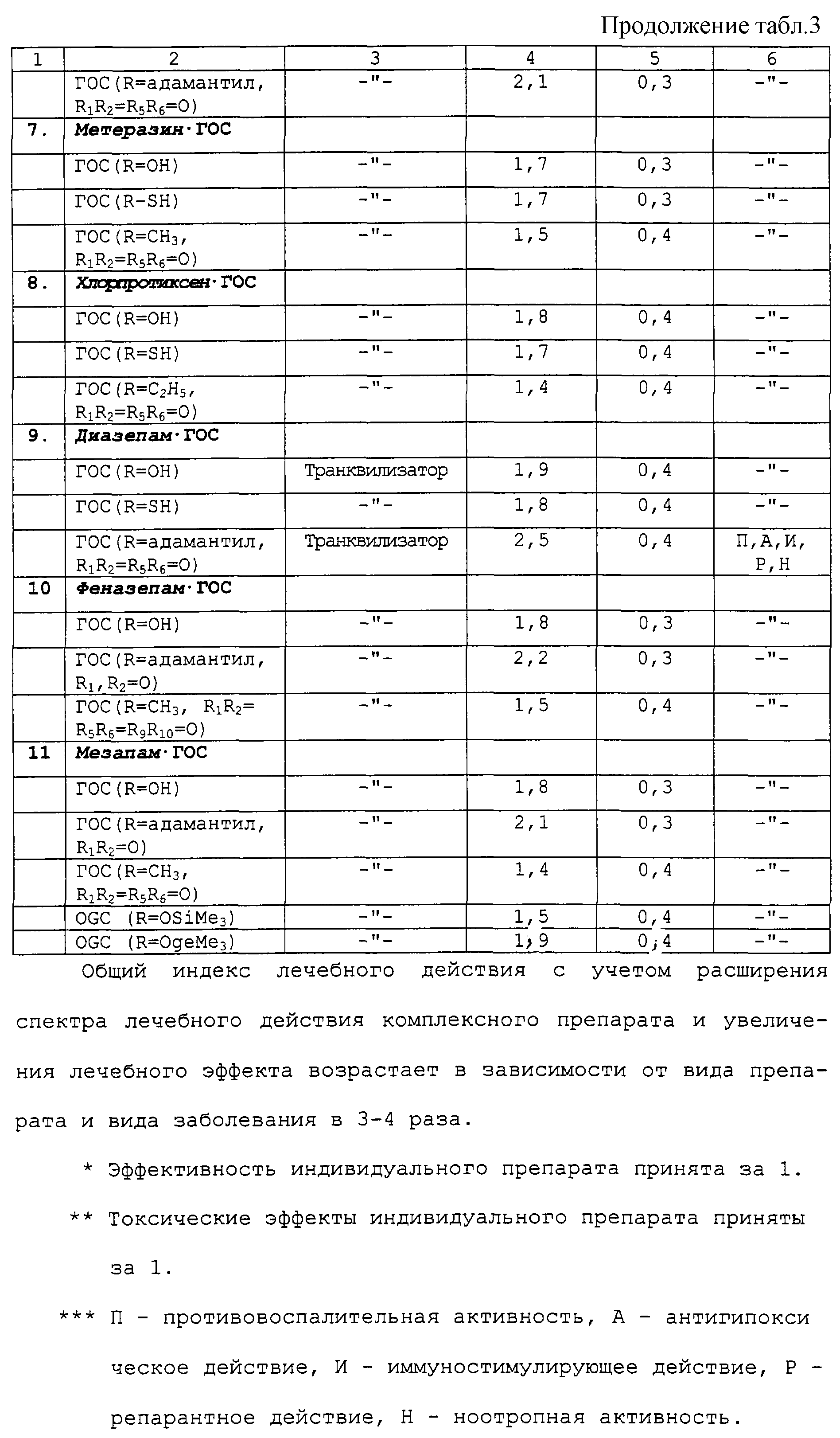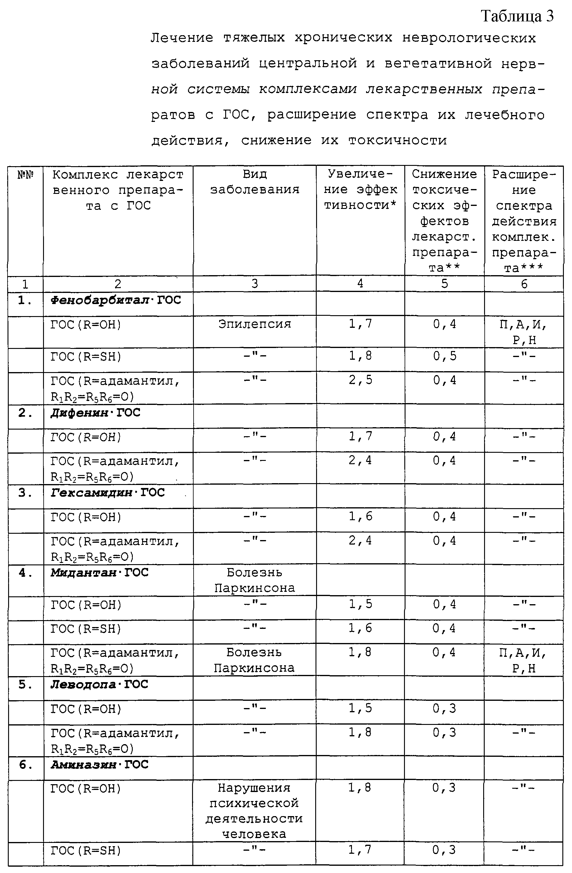 Могут наблюдаться и смешанные типы комплексов. Применение комплексных соединений лекарственных препаратов (L) с ГОС общей формулы (I, II или III) приводит к значительному расширению спектра лечебного действия, усилению лечебного эффекта и снижению токсичности лекарственных средств и биологически активных веществ.