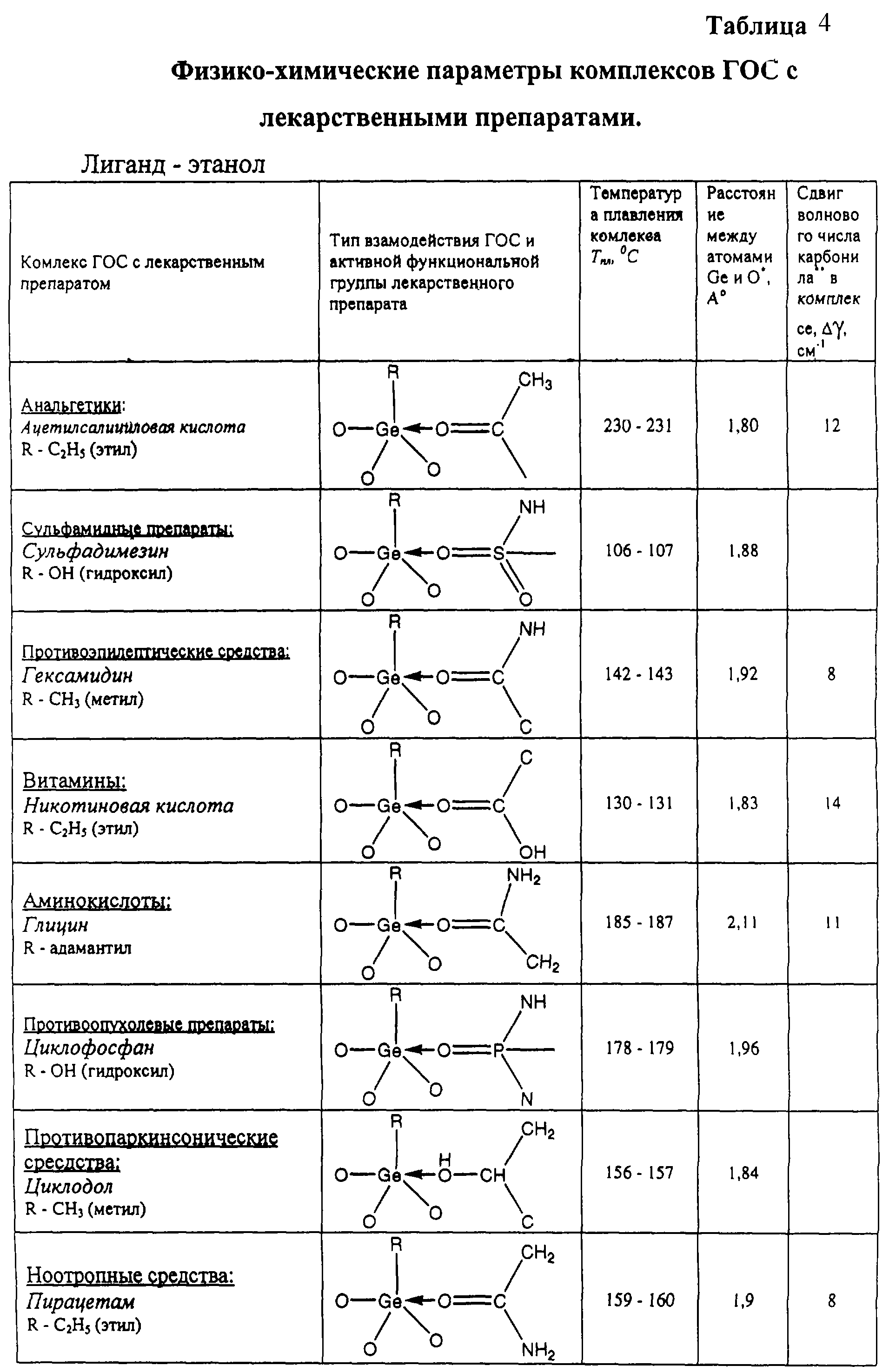 Комплекс представляет собой бесцветные матовые пластинчатые кристаллы округлой формы. Температура плавления: 206-207 С. Данные рентгеноструктурного анализа подтверждают наличие координационного взаимодействия между атомами германия и кислородом активной функциональной группы, длина связи составляет . Сдвиг карбонильной группы по отношению к карбонильной группе в никотиновой кислоте в ИК спектре составляет 8 см-1. В табл.4 приведены физико-химические параметры ГОС с лекарственными препаратами