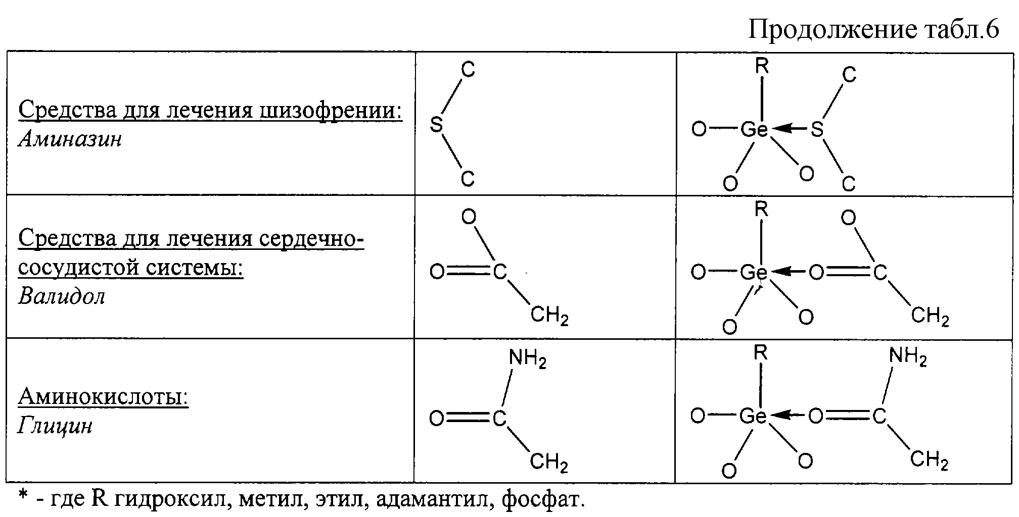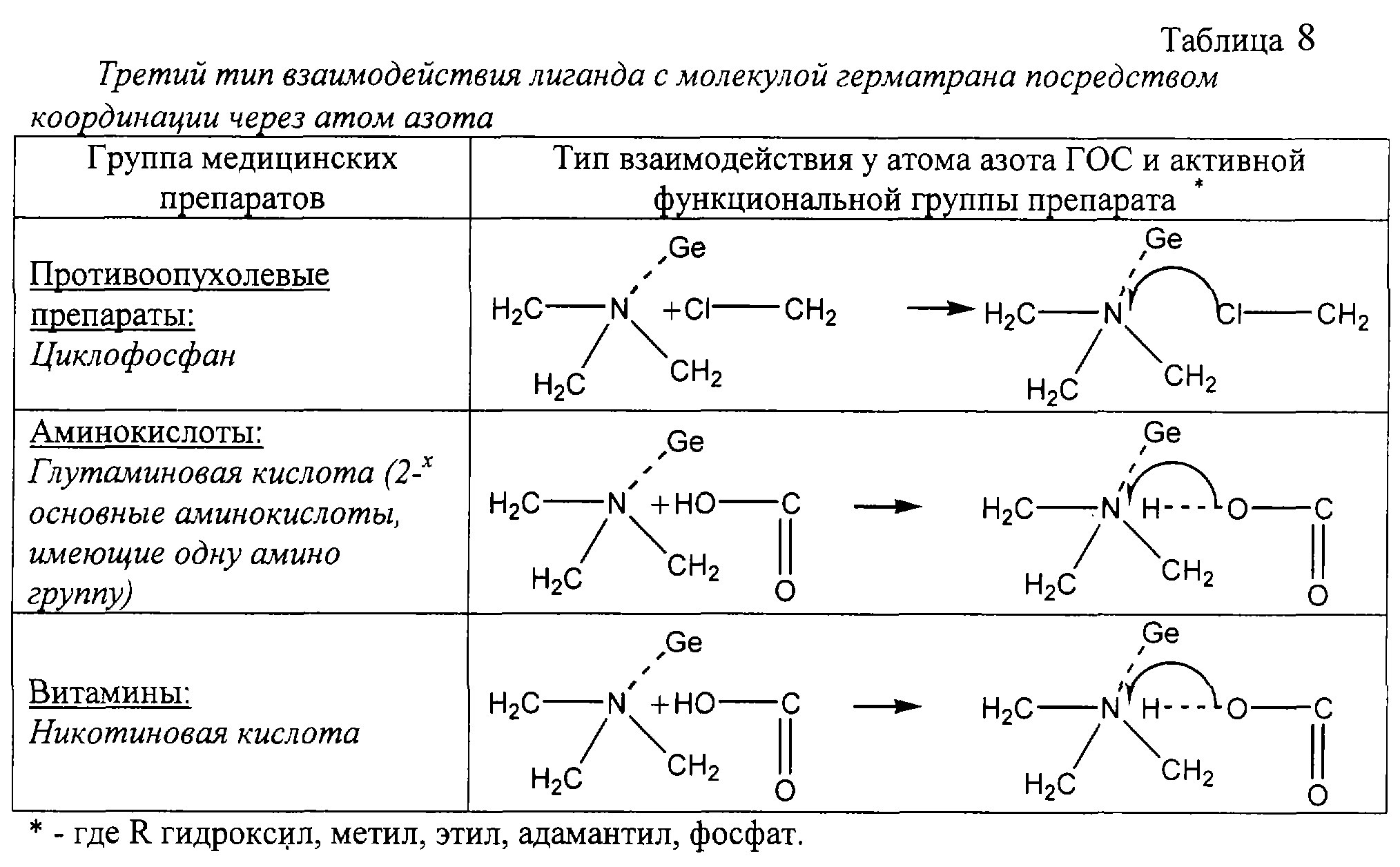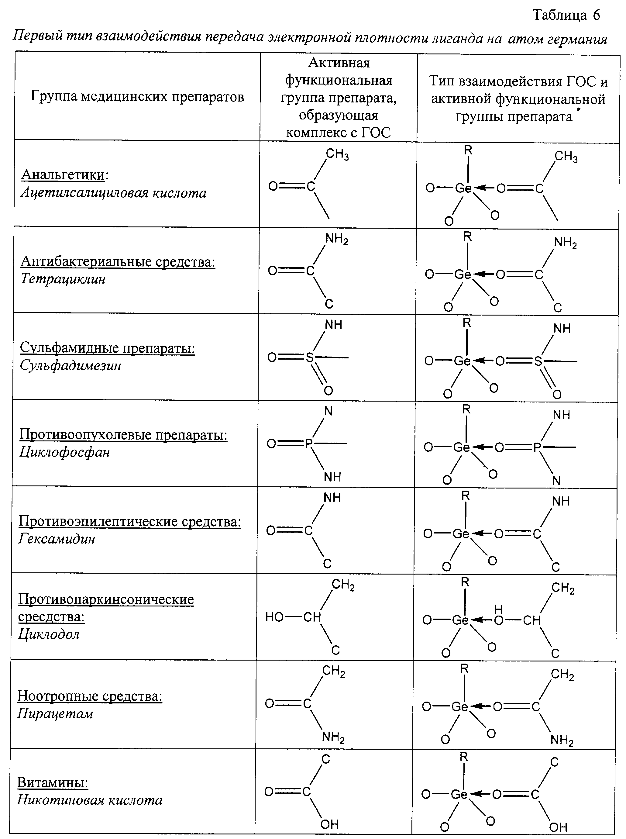 2. За счет расширения координационной сферы атома германия до 6 в результате донорно-акцепторного взаимодействия с атомом германия функциональных групп лекарственных средств и биологически активных веществ, перечисленных в пункте 1.