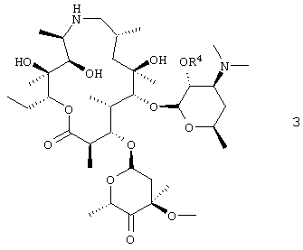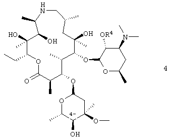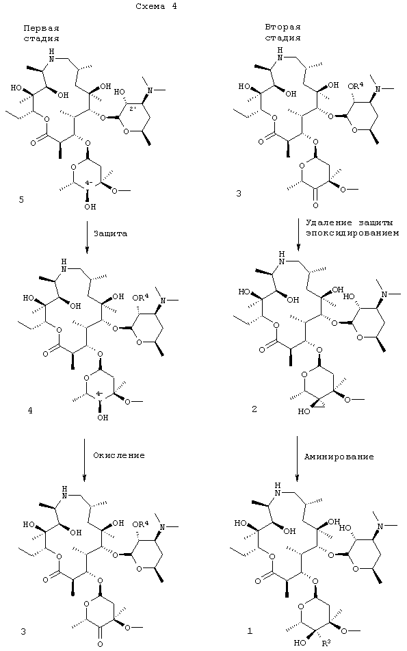Настоящее изобретение относится к способу получения С-4![]() -замещенных производных 9-деоксо-9а-аза-9а-гомоэритромицина А (здесь и далее, “азалид(ы)”), которые могут использоваться в качестве антибактериальных агентов и агентов против простейших у млекопитающих, включая человека, а также рыб и птиц. Данное изобретение также относится к способу получения стабильных промежуточных продуктов заявленных азалидов, а также к кристаллической соли промежуточного соединения в способе получения заявленных азалидов. Данное изобретение также относится к фармацевтическим композициям, содержащим новые соединения, полученные заявленным способом, и к способам лечения бактериальных инфекций и инфекций, вызванных простейшими, у млекопитающих, рыб и птиц путем введения новых соединений, полученных заявленными способами, млекопитающим, рыбам и птицам, нуждающимся в таком лечении.