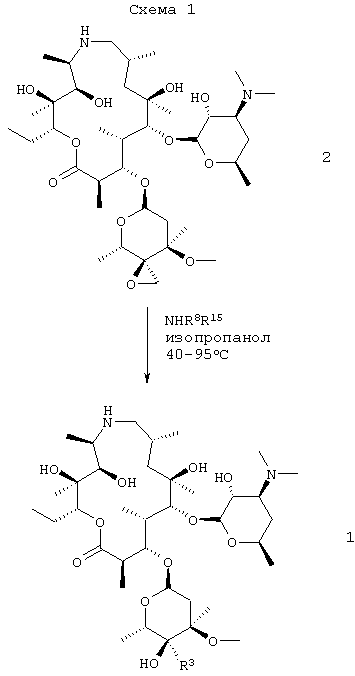 Схемы, приведенные выше, даны лишь для иллюстрации и более подробно описываются ниже и, кроме того, в примерах ниже здесь. На схеме 1 эпоксид формулы 2 преобразовывали в амин формулы 1, где R3 представляет собой –CH2NR15R8, где R15 и R8 такие, как описано выше. В наиболее предпочтительном воплощении изобретения амин представляет собой н-пропиламин, то есть R8 представляет собой н-пропил и R15 представляет собой Н.