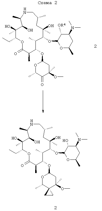 На схеме 2 соединение формулы 2 может быть получено при взаимодействии соединения формулы 3 с метилидом серы при температуре от около -80 С до около -45 С с последующим удалением обычными способами 2 -защитной группы с получением соединения формулы 2. Исходным продуктом в способе, представленном на схеме 1, предпочтительно является соль добавления трифторуксусной кислоты соединения формулы 3, которую сначала преобразуют в форму свободного основания, охлаждают до низкой температуры, около -70 С, и затем проводят взаимодействие с низкотемпературным раствором метилида. Метилид серы представляет собой, предпочтительно, метилид диметилсульфония, например (CH3)2S+CH–2, полученный обычными способами, например, обработкой соли триметилсульфония, например (СН3)3SХ, где Х представляет собой галоген, предпочтительно бром, или сульфонат, более предпочтительно, бромид триметилсульфония, активирующим агентом, таким как гидроксид калия, трет-бутоксид калия, трет-бутоксид натрия, этоксид калия, этоксид натрия, гексаметилдисилазид калия (KHMDS) или метоксид натрия, предпочтительно, трет-бутоксид калия, в эфирном растворителе, таком как ТГФ, или в CH2Cl2, ДМФ или ДМСО или смеси двух или нескольких перечисленных растворителей. Защитную группу удаляют обычными способами, например, каталитическим гидрированием, если R4 представляет собой CBZ.