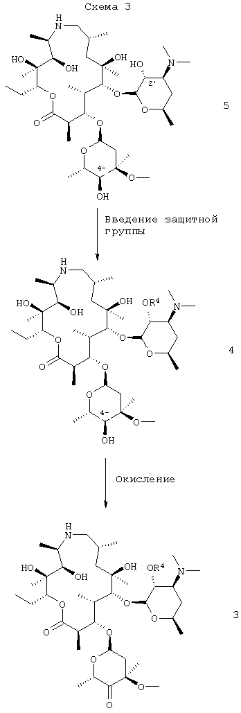 На схеме 3 кетон 4![]() получали из соединения формулы 5 в одном сосуде продолжительным процессом. На первой стадии процесса гидроксигруппу 2 избирательно защищали обычными способами, предпочтительно путем обработки 2 -гидрокси формулы 5, где R4 представляет собой водород, бензилхлорформиатом в дихлорметане с получением соединения формулы 4, где R4 представляет собой бензилоксикарбонил (CBZ). Предпочтительно использовали, по крайней мере, 2 молярных эквивалента бензилхлорформиата с тем, чтобы обеспечить полное преобразование 2 -гидроксигруппы в ее защищенную форму. В качестве растворителя предпочтительным является дихлорметан в том случае, если взаимодействие проводят, используя, по крайней мере, 15 объемов дихлорметана к объему исходного продукта, таким образом сводя к минимуму образование бис-CBZ примесей. Соединение формулы 4, где R4 представляет собой CBZ, может быть выделено в виде дибензоил-D-тартратной соли, что позволяет очистить от возможных бис-CBZ примесей. Однако водный экстракт соединения формулы 4 не является предпочтительным, так как выделение продукта является нестабильным из-за присутствия бензиламина, полученного при аминоалкилировании соединения формулы 4 бензилхлоридом (образованный при замещении бензил-хлорформиата). Соответственно после стадии защиты реакционную смесь предпочтительно использовать непосредственно на второй стадии без выделения соединения формулы 4. Вторая стадия, которую можно проводить в том же сосуде, который использовался в первой части, включая окисление 4![]() -гидроксильной группы с получением 4![]() -кетона формулы 3. Окисление предпочтительно является окислением, активированным ДМСО, как описано выше, то есть его проводят при пониженной температуре, например при от -60-70 С, и включает в себя активацию ДМСО in situ путем добавления трифторуксусного ангидрида к охлажденному раствору соединения в ДМСО с последующим добавлением триэтиламина. Реакционную смесь затем добавляли в воду и постепенно нагревали до температуры окружающей среды. Смесь предпочтительно промывали водой с получением раствора соединения формулы 3.