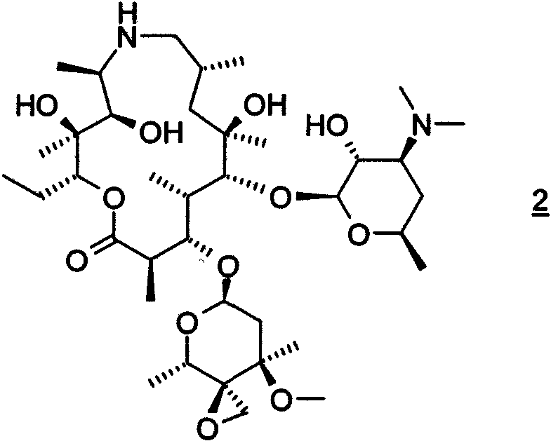К охлажденному до 0-5 С раствору 25 кг (2R,3S,4R,5R,8R,10R,11R,12S,13S,14R)-13-[(2,6-дидезокси-3-С-метил-3-О-метил- -L-рибо-гексопиранозил)окси]-2-этил-3,4,10-тригидрокси-3,5,8,10,12,14-гексаметил-11[[3,4,6-тридезокси-3-(диметиламино)- -D-ксило-гексопиранозил]окси]-1-окса-6-азациклопентадекан-15-она в 425 л метиленхлорида добавляли раствор 13,7 кг бензилхлорформиата в 25 л метиленхлориде, поддерживая температуру ниже 5 С. Полученную смесь взбалтывали при этой температуре в течение трех часов и затем концентрировали до 148 л с получением сухого раствора, содержащего приблизительно 26,6 кг (90%) продукта (с помощью ВЭЖХ-Waters Symmetry C8, I.D. колонка 15 см 3,9 мм, подвижная фаза 25 мМ буфер фосфат калия (рН 7,5):ацетонитрил:метанол (35:50:15), скорость потока 2,0 мл/мин, электрохимическое определение. Время удерживания = 8,2 минут). Эту смесь непосредственно использовали в примере 2.