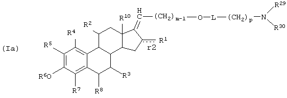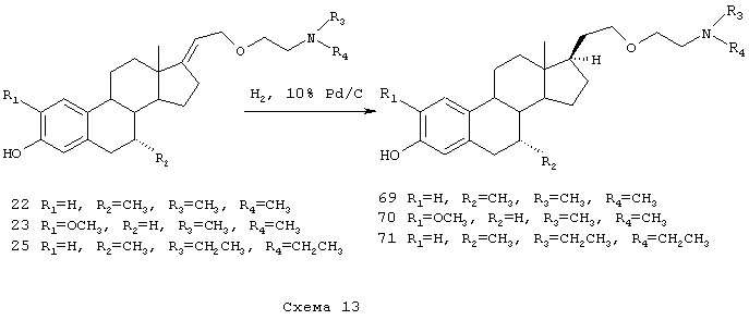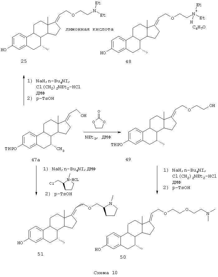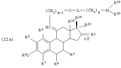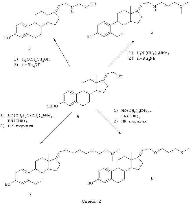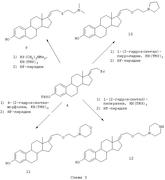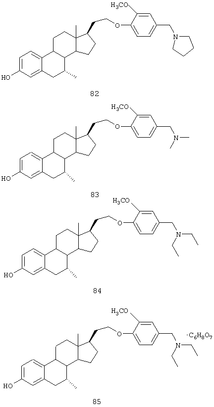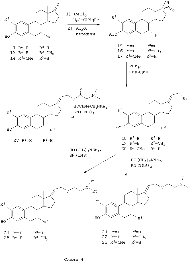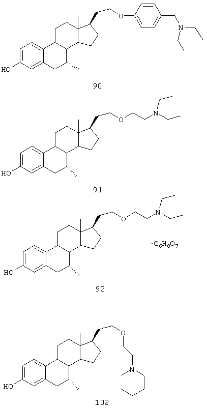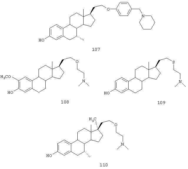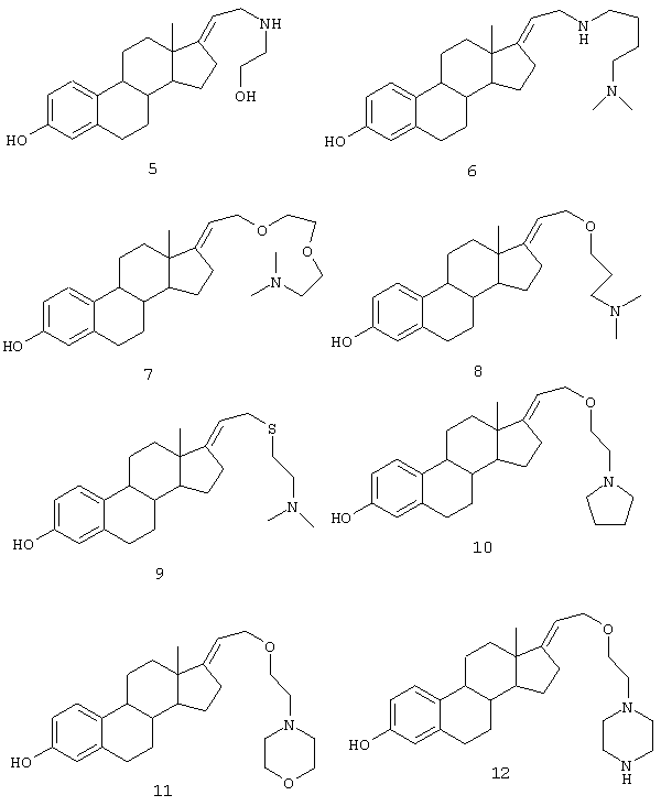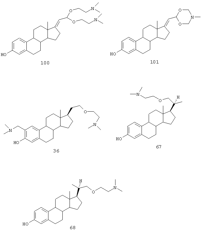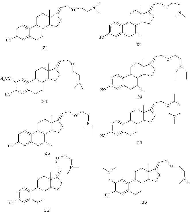 Следующие ссылки относятся к одному или нескольким аспектам данного изобретения и как таковые могут представлять интерес в качестве предпосылок данного изобретения для специалистов в данной области: патент США №2840581, Hogg et al., в котором описаны производные эстрадиола, замещенные в положении 17=СН-СН2OН и имеющие эстрадиол-подобную активность; патент США №3536703, Colton et al., в котором описаны антимикробные производные эстрадиола, замещенные в положении С-3 метоксигруппой и в положении С-17 различными группами, в том числе =C-CH2NR+3(где R обозначает водород или низший алкил или где две группы R образуют циклическую структуру); патент США №3716530, Krubiner et al., в котором описаны стероиды, содержащие различные заместители в положении С-17, в том числе производное эстрадиола, замещенные в положении С-17=СН-СН2Х, где Х обозначает галоген (применимое, как утверждается, в качестве промежуточного продукта в синтезе соединений, относящихся к гестагенным средствам, и противогрибковых агентов); Blickenstaff et al.. Steroids 46(4,5): 889-902 (1985), который относится к производным эстрадиола, имеющим заместители в положении 16, связанные со стероидным ядром через двойную связь, синтезированным как часть поиска новых противораковых агентов; патент Франции №1453210, в котором описаны аналоги эстрадиола, замещенные в положении 17 -СН(СН3)-О-(СН2)2NR’R”, где R’ и R” могут быть алкилом или аралкилом; французский особый патент на лекарственное вещество №М3031, который относится к синтезу 3-гидрокси-20 -диметиламиноэтокси-19-норпрегна-1,3,5(10)-триена; и Qian et al., J. Steroid Biochem. 29 (6):657-664 (1988), где оценивается корреляция между замещением в положении 17 эстрадиола и возможной антиэстрогенной активностью и описаны аналоги эстрадиола, замещенные в положении 17 -О(СН2)2-NR1R2, где R1 и R2 обозначают метил, этил, циклопентил, циклогексил или тетрагидропиранил (ни одно из этих соединений, как было обнаружено, не обладало антиэстрогенной активностью).