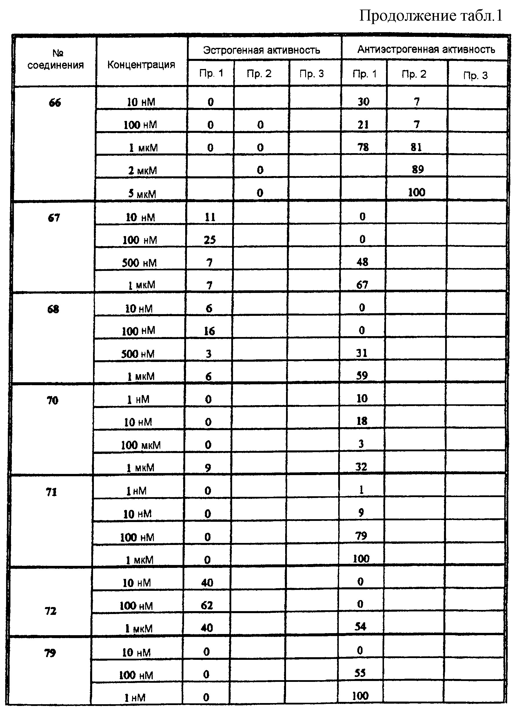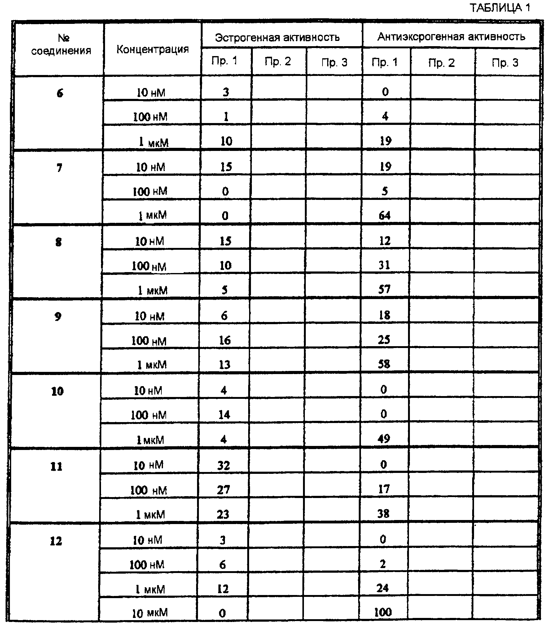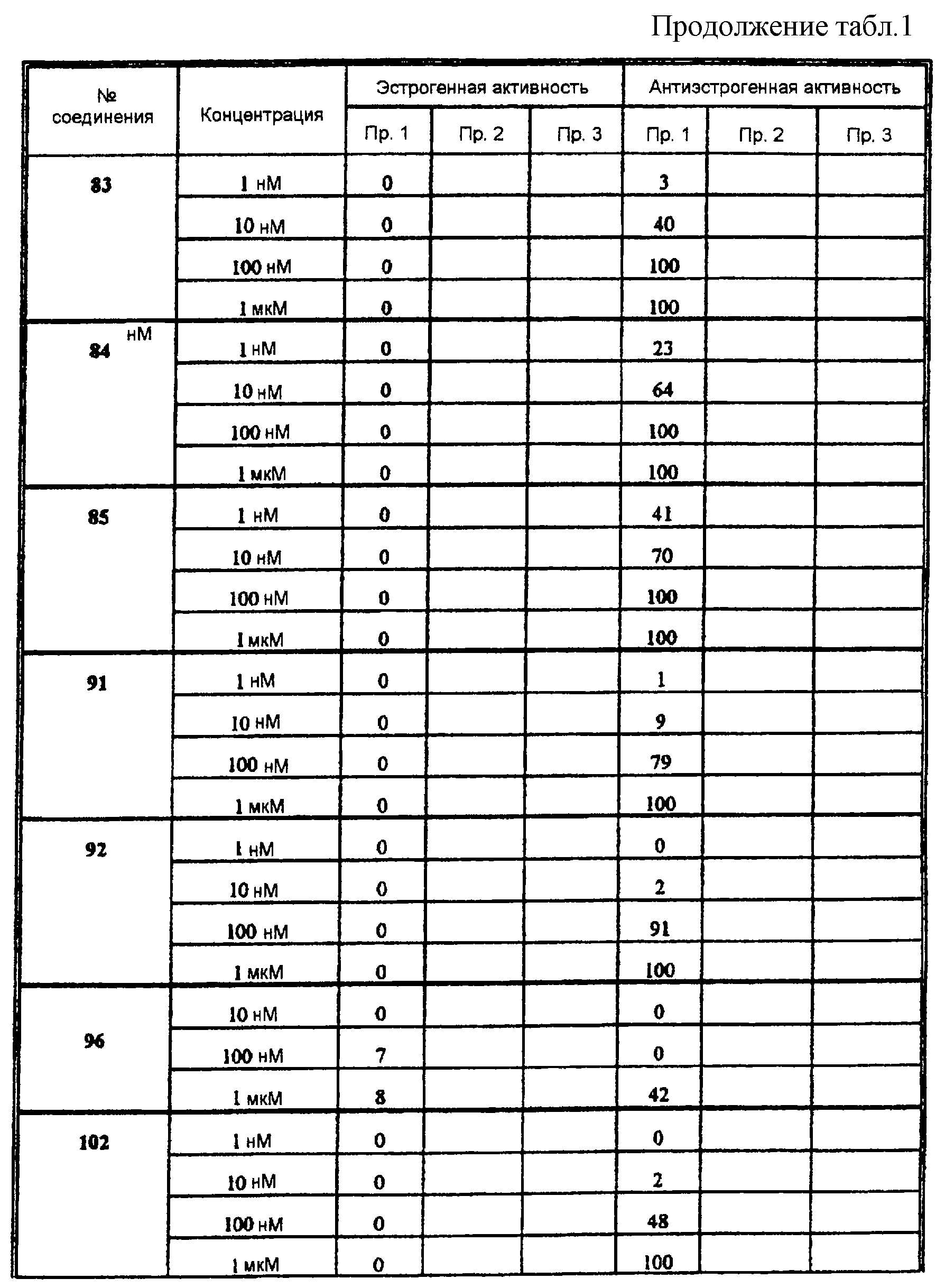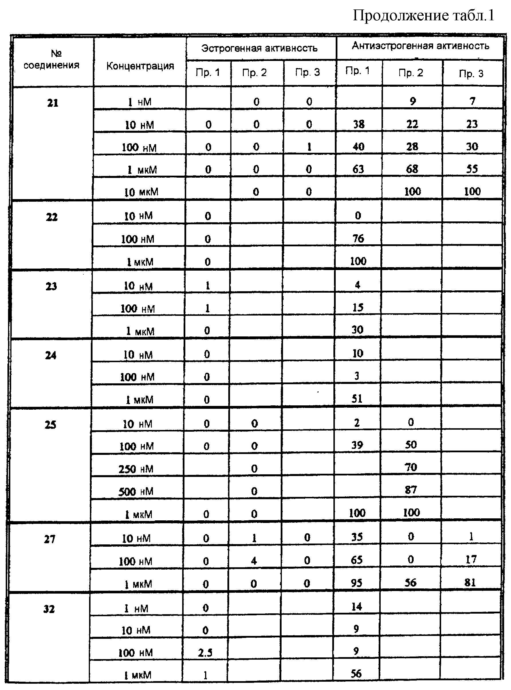 Под “антиэстрогенным” в применении здесь подразумевают соединение, которое имеет тенденцию ингибирования in situ продуцирование эстрогенов, таких как эстрадиол, после введения их индивидууму-млекопитающему. Не претендуя на теоретическое объяснение, авторы изобретения считают, что соединения данного изобретения являются антиэстрогенными по характеру благодаря конкурентному блокированию связывания эстрогена с его рецептором, в частности, в ткани молочной железы и матки. Антиэстрогенная активность может быть оценена по ингибированию эстрадиолиндуцированной активности щелочной фосфатазы в клетках Ишикава человека, например, с использованием процедур, описанных в примере 40 в описании.