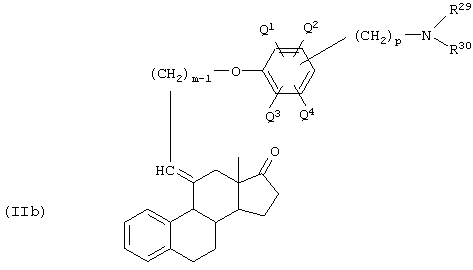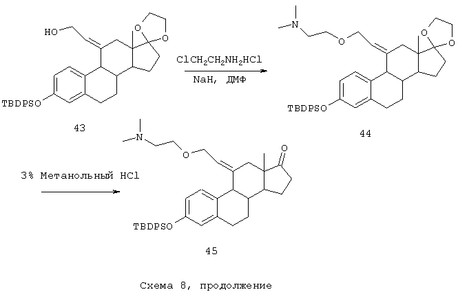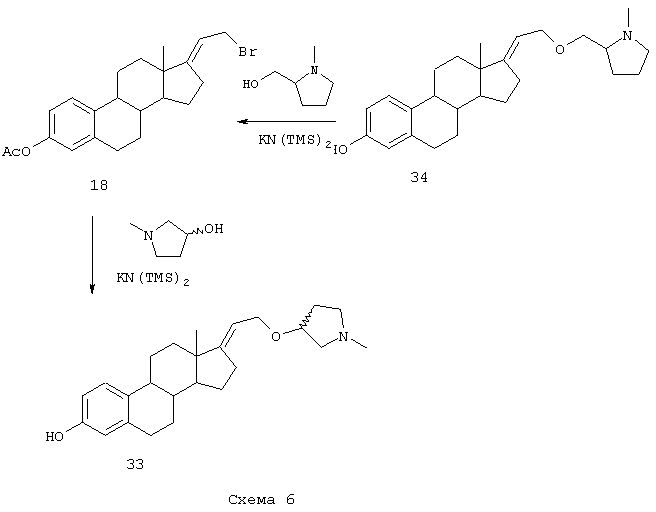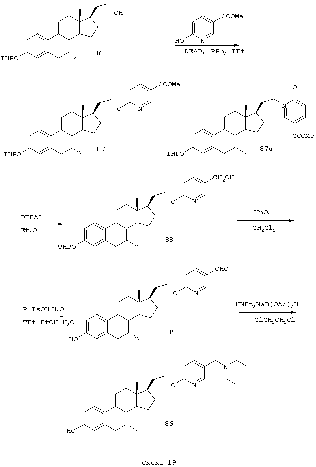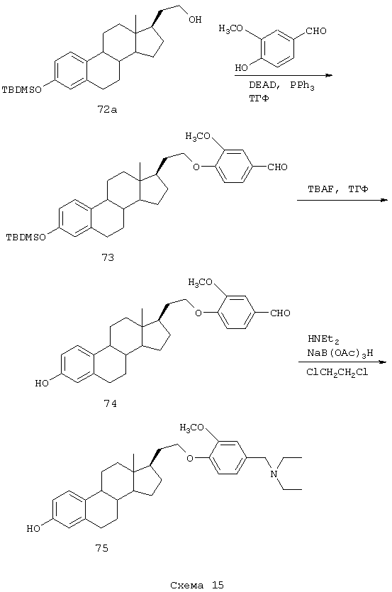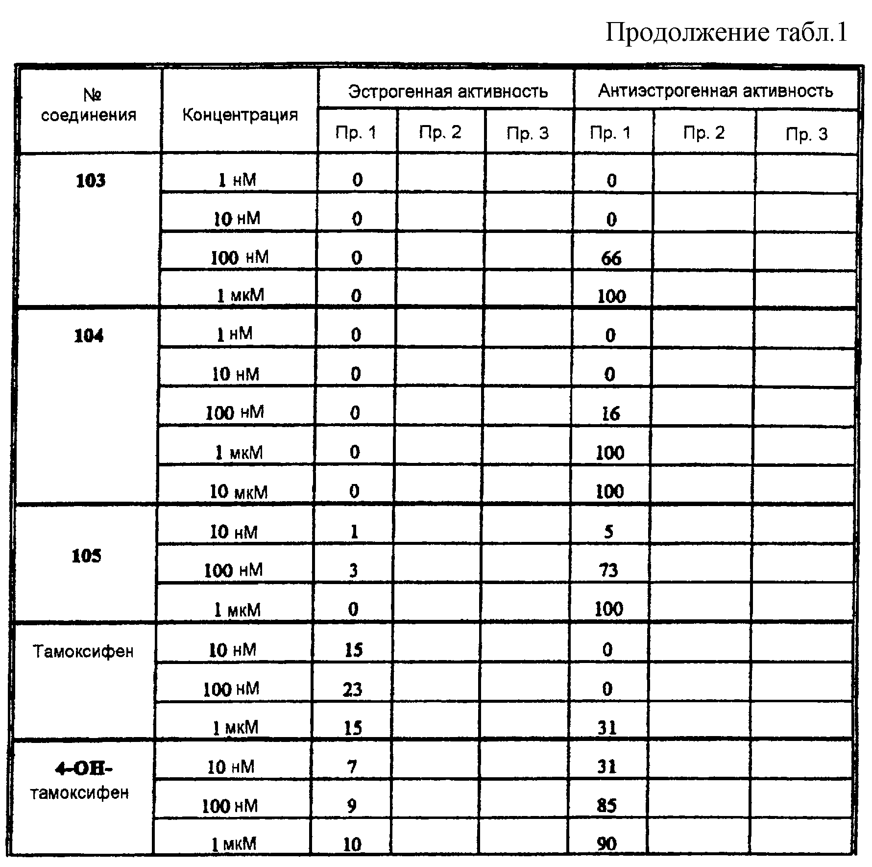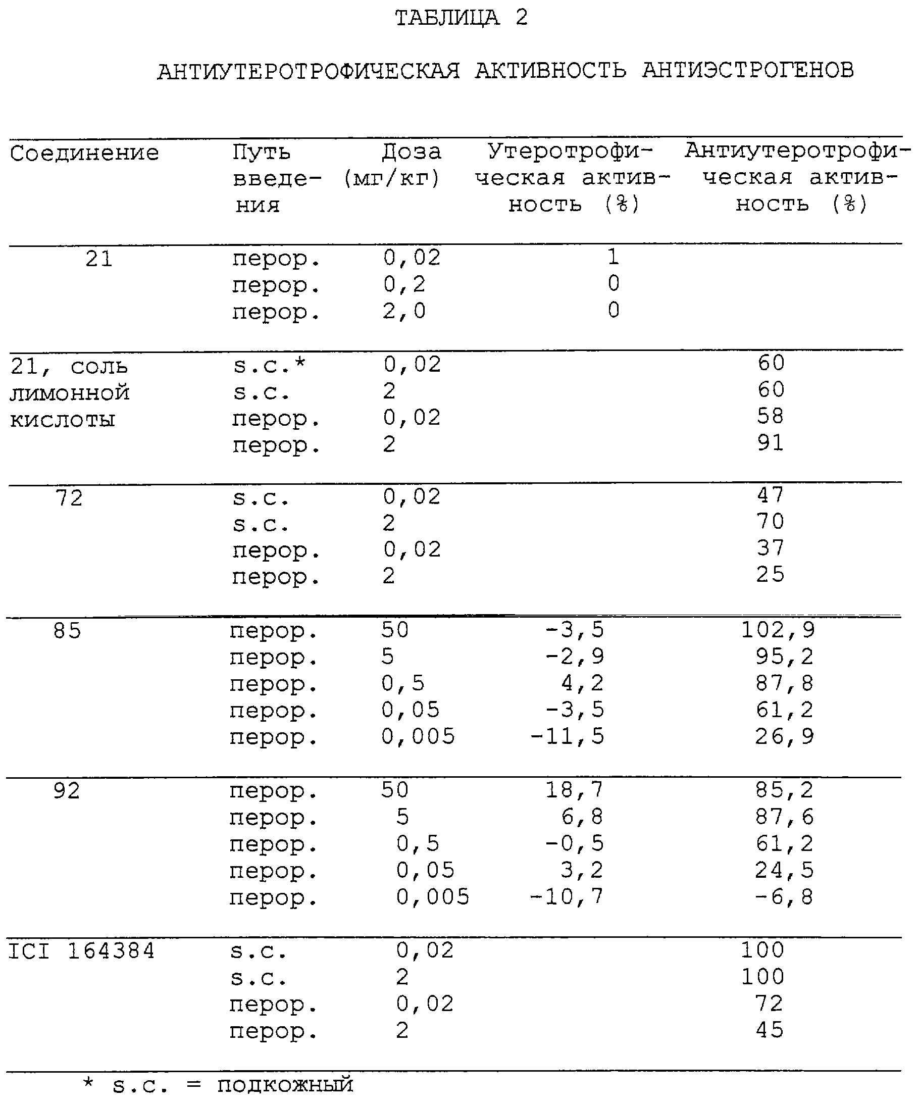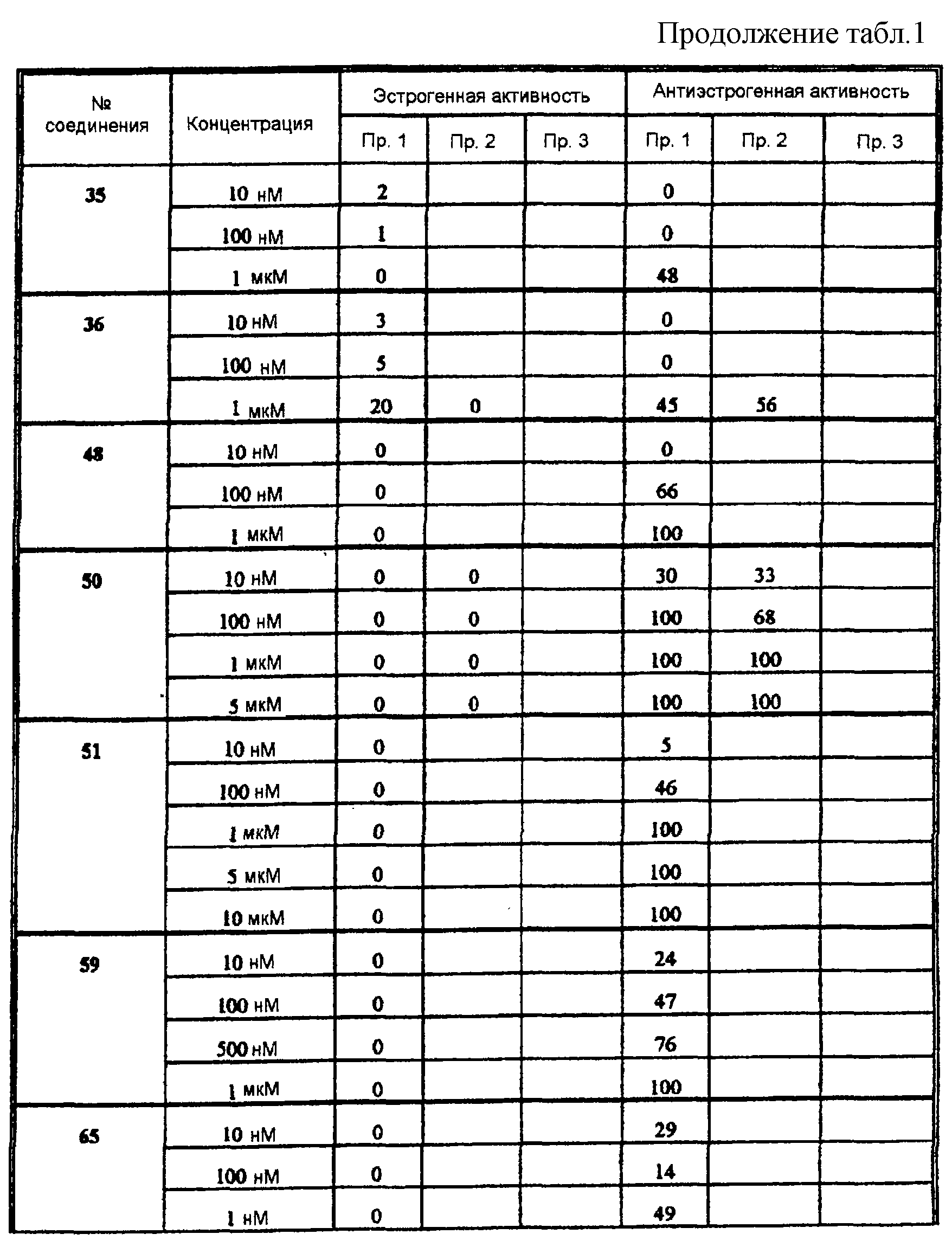 Под “антиэстрогенным” в применении здесь подразумевают соединение, которое имеет тенденцию ингибирования in situ продуцирование эстрогенов, таких как эстрадиол, после введения их индивидууму-млекопитающему. Не претендуя на теоретическое объяснение, авторы изобретения считают, что соединения данного изобретения являются антиэстрогенными по характеру благодаря конкурентному блокированию связывания эстрогена с его рецептором, в частности, в ткани молочной железы и матки. Антиэстрогенная активность может быть оценена по ингибированию эстрадиолиндуцированной активности щелочной фосфатазы в клетках Ишикава человека, например, с использованием процедур, описанных в примере 40 в описании.