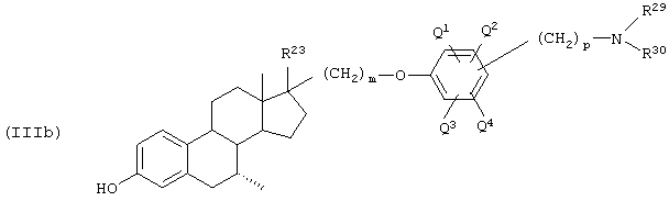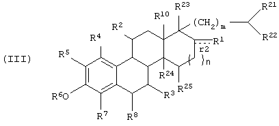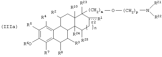 В другом варианте данное изобретение относится к фармацевтическим композициям, содержащим, в комбинации, фармацевтически приемлемый носитель и антиэстрогенное соединение данного изобретения, т.е. агент, который является антиэстрогенным, но имеет сниженную эстрогенную активность, как может быть определено по степени ингибирования и степени стимуляции соответственно эстрадиол-индуцируемой щелочной фосфатазы в клетках Ишикава человека. Предпочтительными подобными соединениями являются стероиды, имеющие ядро 1,3,5-эстратриена, которое является 17-дезокси, и особенно предпочтительные соединения имеют боковую цепь – (СН2)m-CHR21R22 в положении 17, как показано в структурной формуле (III), причем m, R21 и R22 имеют указанные выше значения. Обычно эти фармацевтические композиции содержат в качестве активного агента соединение, определенное структурными формулами (I), (II) или (III).